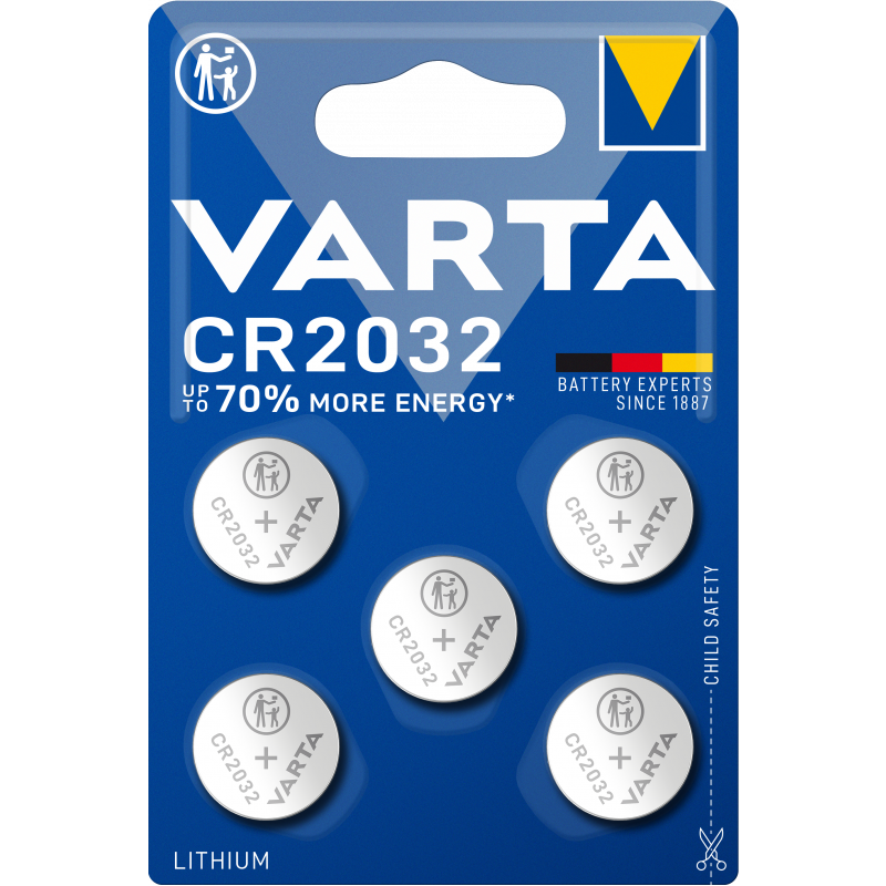 A Varta Lithium Coin CR2032 gombelem 230 mAh 3V-os 5-Darabos csomagban kapható. A prémium VARTA lítium gombelemeket úgy tervezték, hogy megbízható energiát biztosítsanak kis elektronikai eszközök számára. Ezek az elemek a legmagasabb teljesítményt nyújtják impulzus- és folyamatos kisütési alkalmazásokhoz. Minden VARTA lítium gombelem gyermekbiztos csomagolásban érkezik és megfelel a legmagasabb biztonsági előírásoknak. Tökéletesek különféle alapvető és intelligens alkalmazásokhoz, mint például kulcstartók, távirányítók, mérlegek, okosotthon eszközök és sok más kis elektronikai készülék. Garantáltan a legjobb minőség és élettartam.