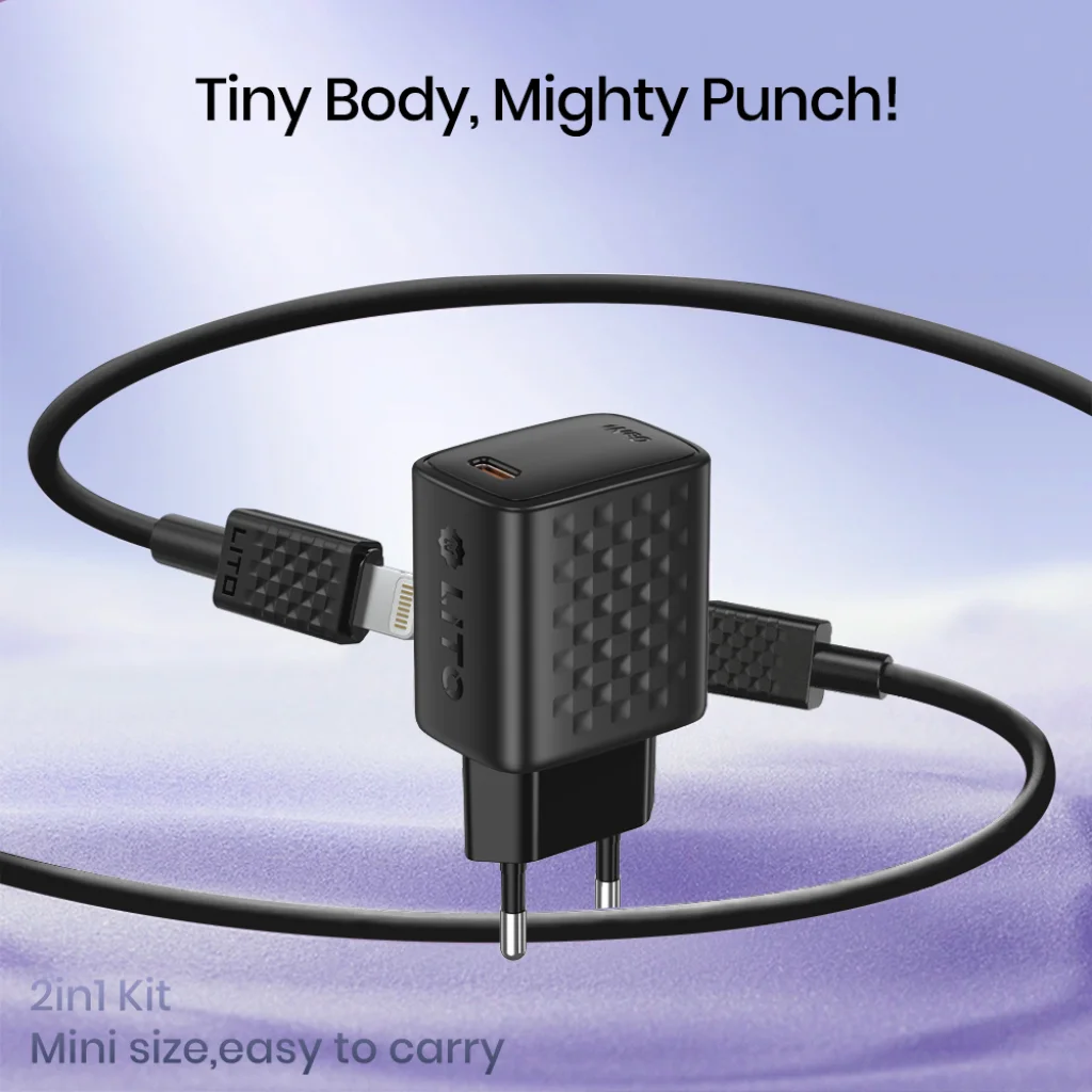 Ez a "2 az 1-ben kit" tartalmaz egy Lito LC17L PD30W GaN fali töltőt (EU csatlakozóval) és egy 1 méteres Type-C – Lightning adatkábelt, így azonnal használatra kész. A töltő fekete színben kapható, és széles körű kompatibilitással rendelkezik a legtöbb gyors töltési protokollal. Képes tölteni az Apple eszközöket a mellékelt Lightning kábel révén, valamint más Type-C kompatibilis készülékeket is (megfelelő Type-C - Type-C kábellel).
