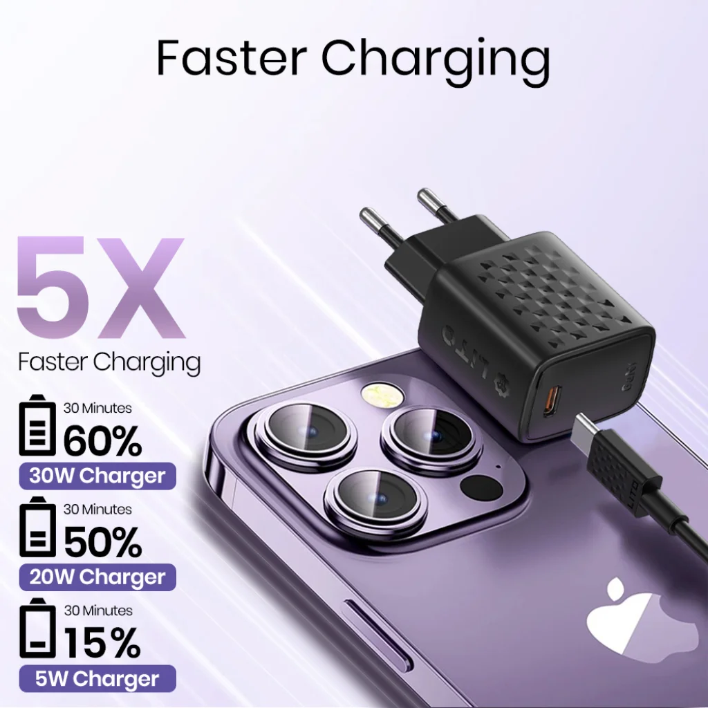 Ne pazarolja idejét a lassú töltésre! A Lito LC17L fali töltő PD30W (Power Delivery 30W) kimenettel rendelkezik, amely az ultragyors töltést biztosítja. A GaN (Gallium Nitride) technológia optimalizálja a teljesítményt és a hatékonyságot, lehetővé téve, hogy eszközét rekordidő alatt feltöltse. Tapasztalja meg az akár 5X gyorsabb töltést:
