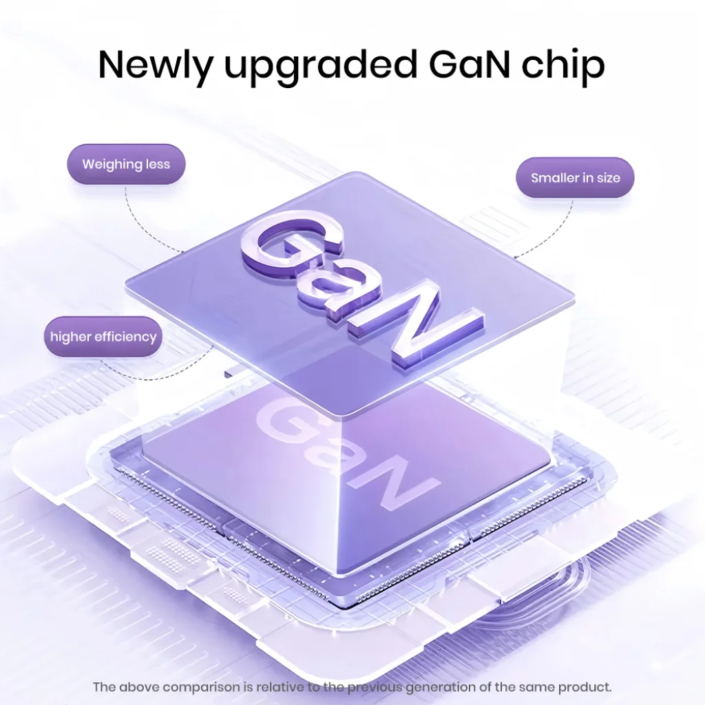 Az újonnan továbbfejlesztett GaN chip a modern töltéstechnológia alapja. Ez a Gallium Nitride alapú chip nemcsak kisebb méretet és alacsonyabb súlyt tesz lehetővé a töltő számára, hanem jelentősen növeli annak hatékonyságát is. Ennek eredménye egy erősebb, megbízhatóbb és energiatakarékosabb töltő, amely alacsonyabb hőmérsékleten működik.
