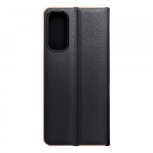 Elegáns tok fém kerettel a telefon fokozott védelme érdekében. Az attraktív textúra és a kellemes tapintású anyag stílusos tokot hoz létre, amely kiemeli a készülék modern dizájnját. A puha velúr anyag belül és a tartó részben mindkét oldalról védi a készüléket a sérülésektől és karcolásoktól. A fogantyú rugalmas szilikonból készült és rendelkezik kivágásokkal. Az alumínium keret a széleken erősebbé teszi a tokot és még inkább védi a készüléket. A fém és az eredeti anyag kombinálása egyedi és modern kompozíciót hoz létre, amelynek köszönhetően a készülék stílusos és elegáns megjelenést nyer. A tok egy kis zsebbel is rendelkezik, amely kényelmes dokumentumok vagy bankjegyek tárolására szolgál. A tok vízszintes alapot képez a filmek vagy fotók megtekintéséhez. Az erős mágnes biztosítja a tok könnyű nyitását és zárását, valamint megakadályozza a véletlen kinyílást.