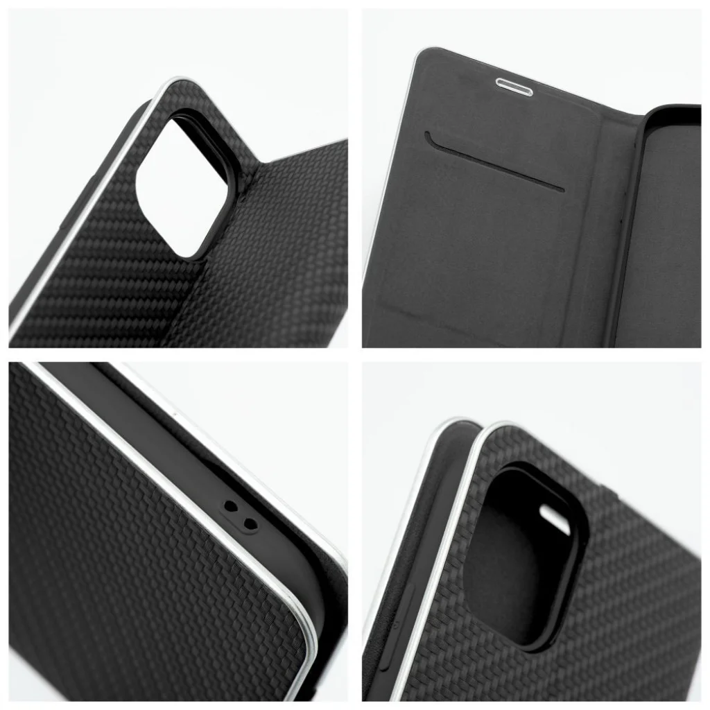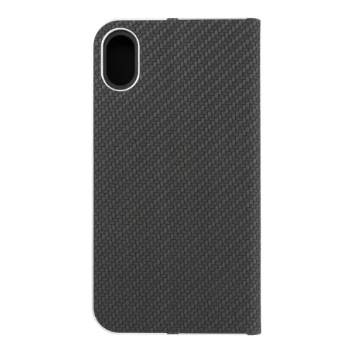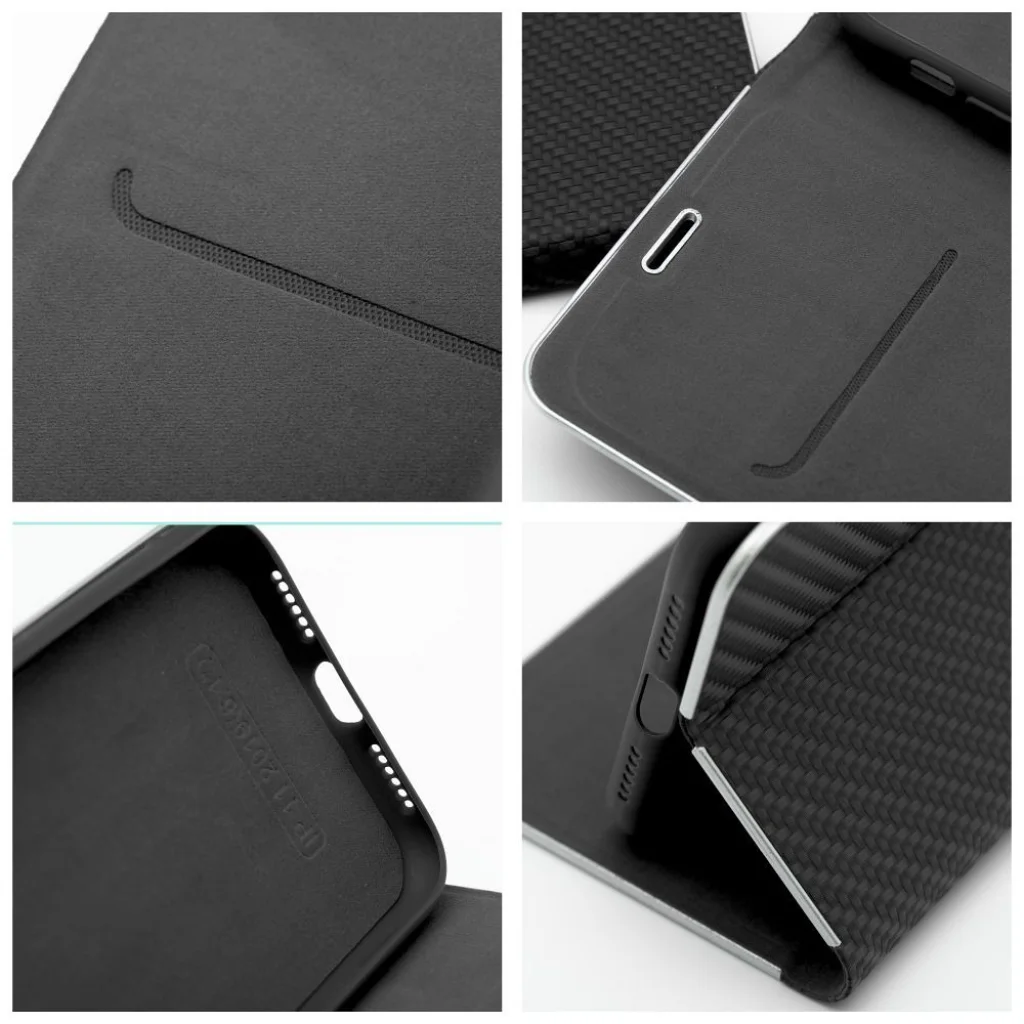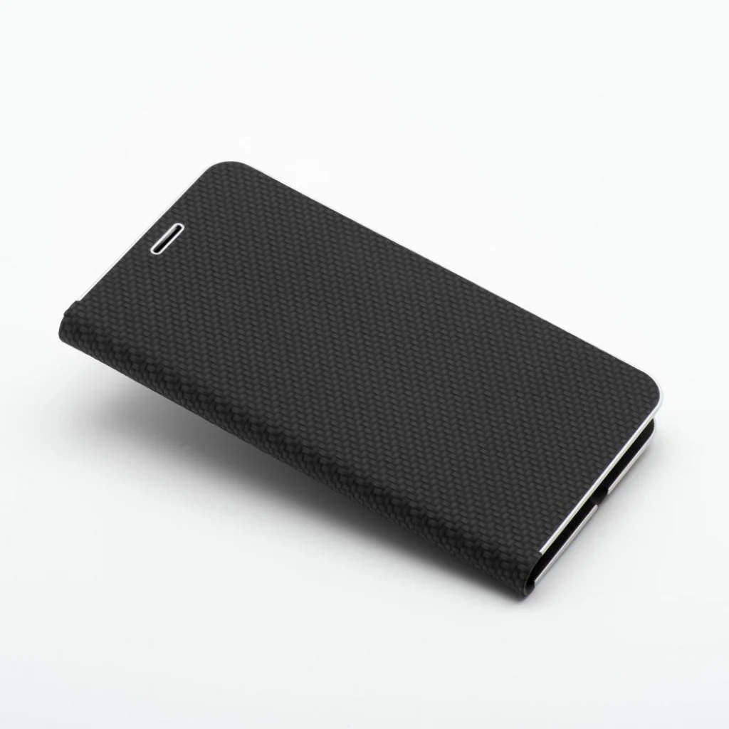 Elegáns tok fém kerettel a telefon fokozott védelme érdekében. Az attraktív textúra és a kellemes tapintású anyag stílusos tokot hoz létre, amely kiemeli a készülék modern kialakítását. Puha velúr anyag belül és a tartó részben biztosítja, hogy a készülék mindkét oldalról védve legyen a sérülésektől és karcolásoktól. A fogantyú rugalmas szilikonból készült és kivágásokkal rendelkezik. Az alumínium keret a széleken erősebbé teszi a tokot és még jobban védi a készüléket. A fém és az eredeti anyag kombinációja egyedi és modern kompozíciót hoz létre, amelynek köszönhetően a készülék stílusos és elegáns megjelenést nyer. A tok egy kis zsebbel is rendelkezik kézre eső dokumentumok vagy bankjegyek számára. A tok vízszintes alappal rendelkezik a filmek vagy fotók megtekintéséhez. Az erős mágnes biztosítja a tok könnyű nyitását és zárását, valamint megakadályozza a véletlen kinyílást.