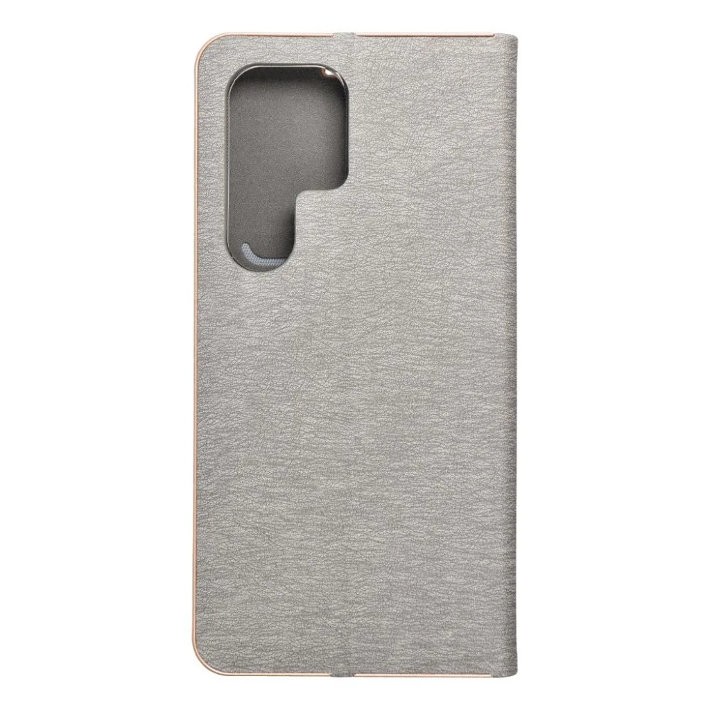 Elegáns tok fém kerettel a telefon fokozott védelme érdekében. Vonzó textúrája és kellemes tapintású anyaga stílusos tokot alkot, amely kiemeli a készülék modern dizájnját. Puha velúr anyag a belső részén és a tartó részben, amely megvédi a készüléket mindkét oldalról a sérülésektől és karcolásoktól. A tartó rugalmas szilikonból készült és kivágásokkal rendelkezik. Az alumínium keret a széleken erősebbé teszi a tokot és még jobban védi a készüléket. A fém és az eredeti anyag kombinációja egyedi és modern kompozíciót hoz létre, melynek köszönhetően a készülék stílusosan és elegánsan mutat. A tok egy kis zsebbel is rendelkezik a praktikus dokumentumok vagy bankjegyek számára. A tok vízszintes bázisból áll, filmek vagy fényképek nézéséhez. Egy erős mágnes biztosítja a könnyű zárást és nyitást, valamint megakadályozza a tok véletlen kinyílását.