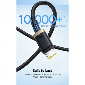 - Több mint 10 000 hajlítási teszt: A Baseus Dura kábel bizonyítottan rendkívül ellenálló. Ez a teszteredmény garantálja, hogy a kábel még intenzív és mindennapi használat mellett is hosszú ideig megbízhatóan működik, igazolva robusztus kialakítását.