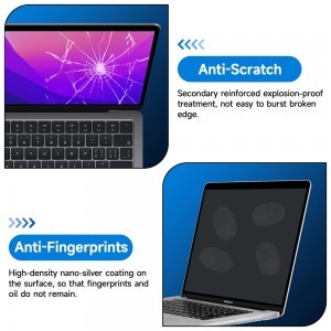 • Karcállóság és ütésvédelem: A prémium PET film másodlagosan megerősített, robbanásbiztos kezeléssel készült, amely kiválóan ellenáll a karcolásoknak, horzsolásoknak és a kisebb ütődéseknek, megóvva ezzel a MacBook Pro kijelzőjét. A fólia szélei nehezen törnek vagy repednek.