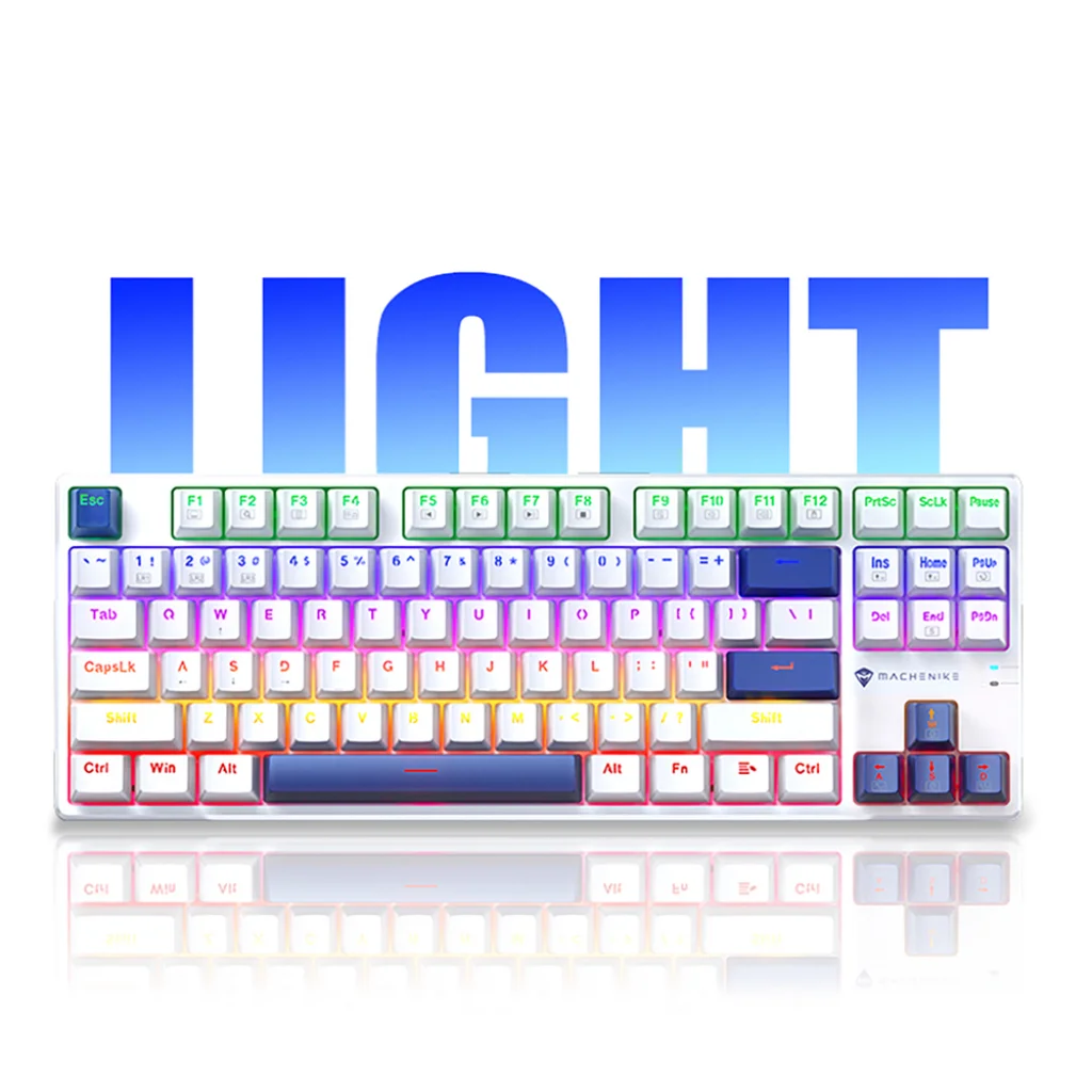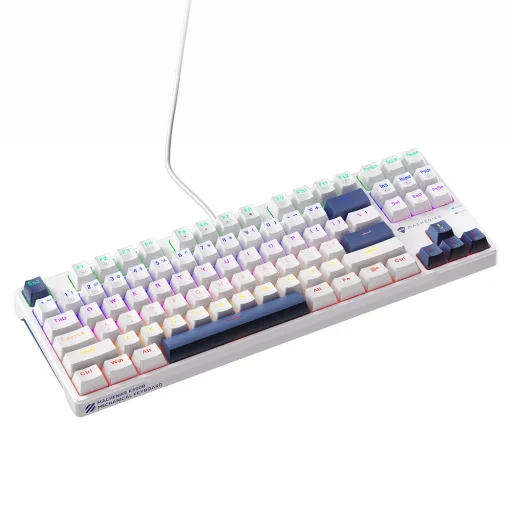 A Machenike K500B-B87 87 gombos TKL (Tenkeyless) elrendezése optimális egyensúlyt teremt a funkcionalitás és a helytakarékosság között. Elhagyva a numerikus padot, több értékes hely marad az egér precíz mozgatásához, ami különösen intenzív játékmenetek során létfontosságú. A kompakt méret ellenére minden kulcsfontosságú funkció könnyedén elérhető, garantálva a zökkenőmentes és gyors reakcióidőt, a letisztult fehér billentyűzeten elegánsan kiemelkednek a sötétkék accent gombok, mint például az Esc, a szóköz vagy az Enter.