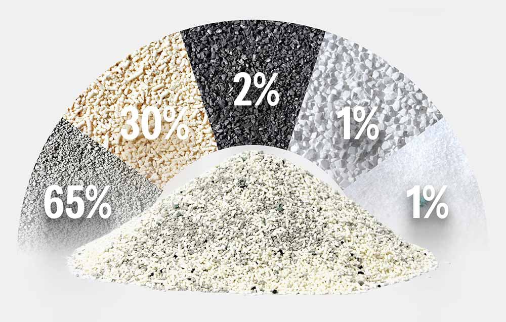 A Catlink vegyes alom 65%-ban bentonitból és 30%-ban tápiókából áll, valamint hozzáadott aktív szenet, szódabikarbónát és szilikagélt tartalmaz. Szagtalan és természetes összetételének köszönhetően biztonságos a macskák és az emberek számára egyaránt. Ez a keverék 99%-kal kevesebb port is termel, mint a hagyományos termékek, ami megakadályozza, hogy a por a levegőbe kerüljön, és minimálisra csökkenti a légúti irritáció kockázatát. Ugyanakkor a szódabikarbóna hozzáadása fertőtlenítő hatású, semlegesíti a baktériumokat és csökkenti a kellemetlen szagok kialakulásának kockázatát.
