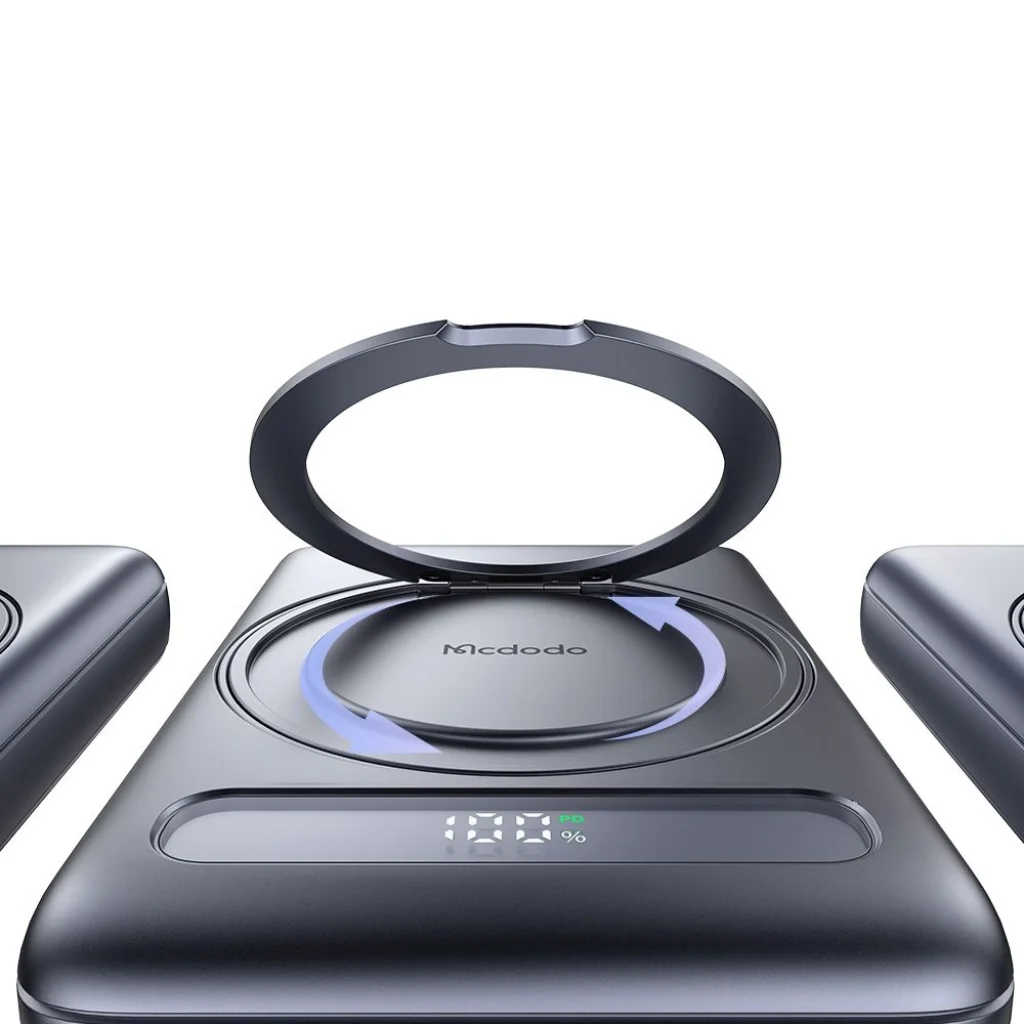 - Beépített 360°-os gyűrűs állvány: A Mcdodo Meta power bank egyedi tulajdonsága a 360°-ban forgatható gyűrűs állvány. Ez lehetővé teszi, hogy telefonját kényelmesen elhelyezze fekvő vagy álló módban videónézéshez, videóhívásokhoz vagy böngészéshez. Ezen kívül stabil markolatként is szolgálhat.