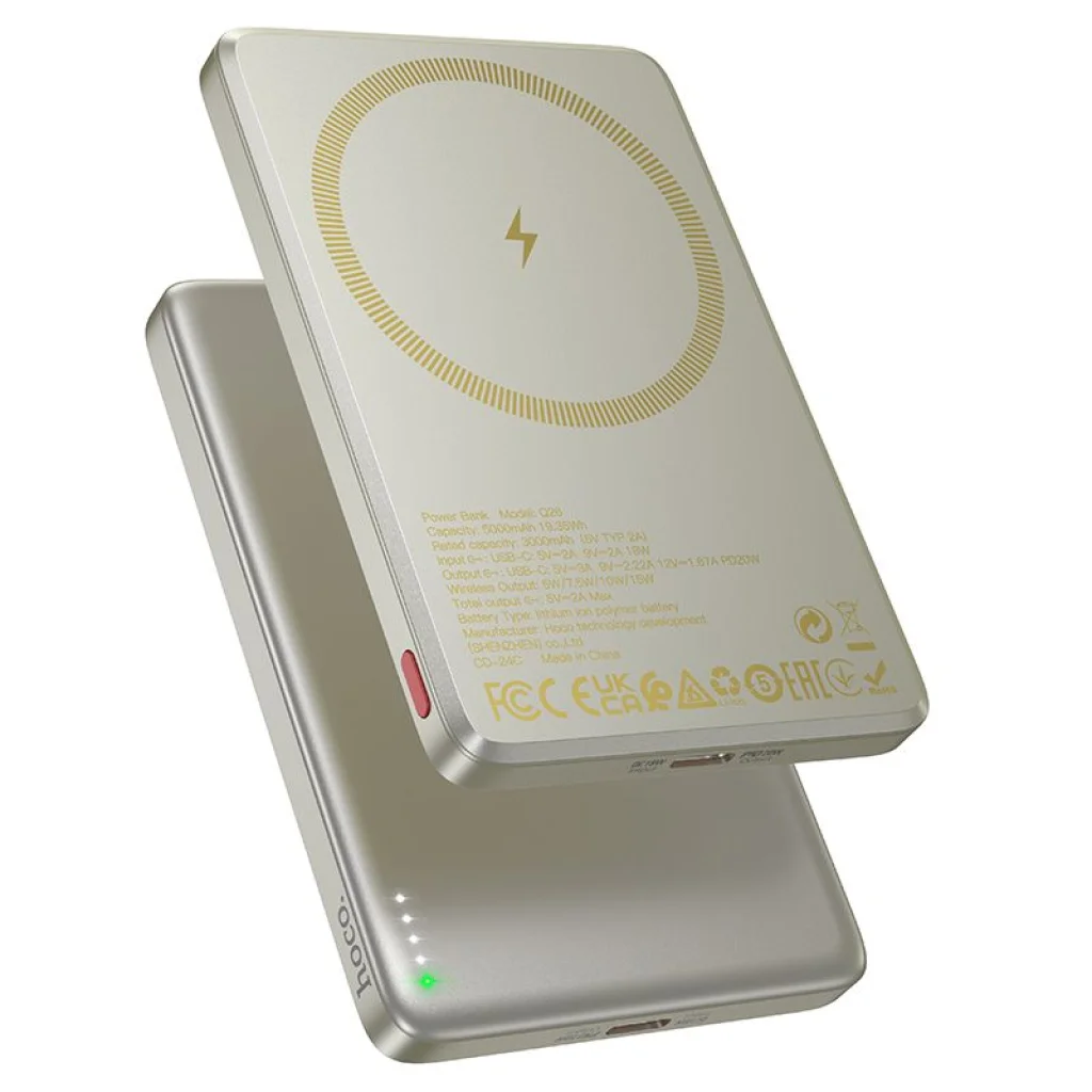 A Hoco Q26 hordozható powerbank 5000 mAh kapacitással készült azoknak a felhasználóknak, akik értékelik az elegáns megjelenést és a korszerű technológiát. A MagSafe, PD (Power Delivery) és QC (Quick Charge) kompatibilitásnak köszönhetően ez a modell ötvözi a funkcionalitást, a stílust és a megbízhatóságot. A termék előnyei: