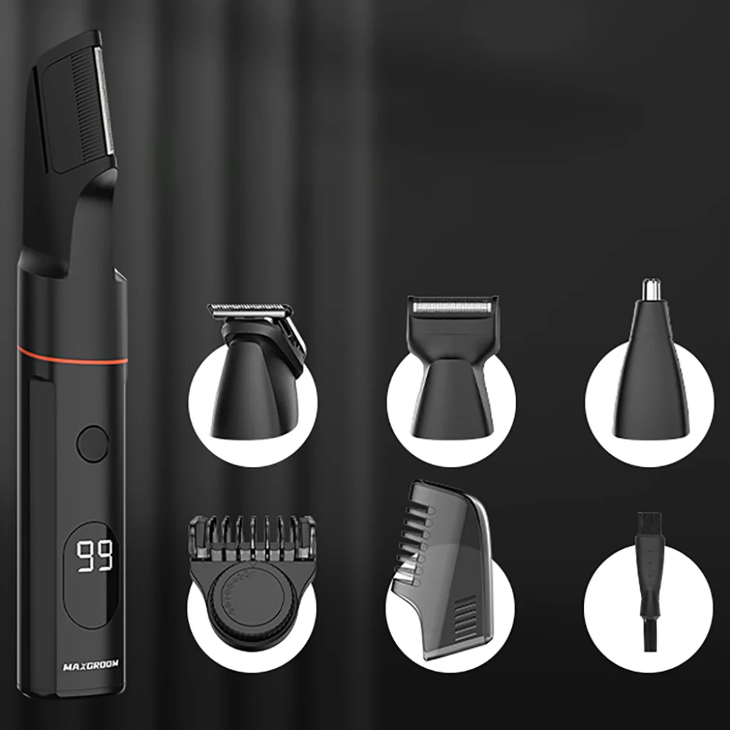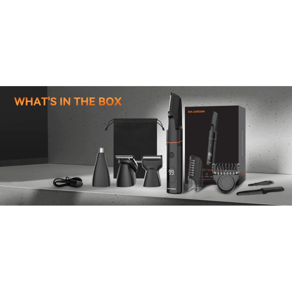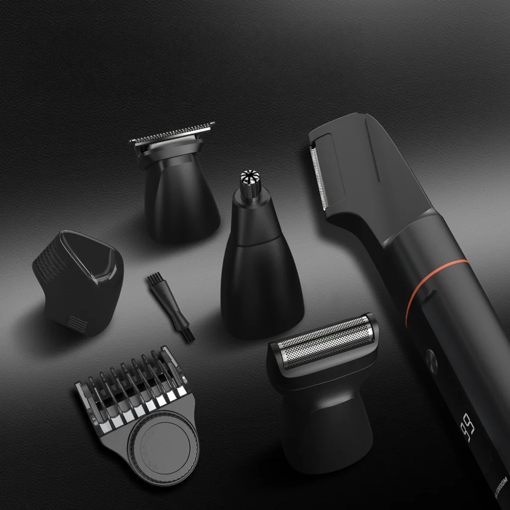 Csomag tartalma: trimmer, V-alakú test trimmer, borosta trimmer, fólia trimmer, orr- és fültrimmer, 1-9 mm állítható fésű, USB-C kábel, tisztítókefe, tok, használati útmutató