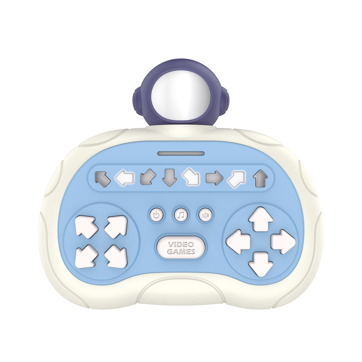 Kulcsfontosságú jellemzője a feltűnő űrhajós fej, amely modern, gyermeki-futurista megjelenést kölcsönöz az eszköznek. A világos színek és az ergonomikus forma biztosítják, hogy a játék jól illeszkedjen a kézbe, és esztétikailag vonzó legyen a fiatalabb felhasználók számára.