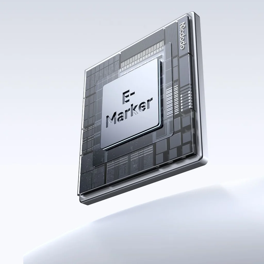 A beépített E-Marker chip kulcsfontosságú a biztonságos működéshez. Ez az intelligens chip folyamatosan kommunikál a csatlakoztatott eszközökkel a szükséges teljesítményről, szabályozza az áramot és védi a készülékeket a túltöltéstől, túlmelegedéstől és egyéb elektromos hibáktól. Ezáltal Ön teljes nyugalomban, maximális hatékonysággal töltheti eszközeit.