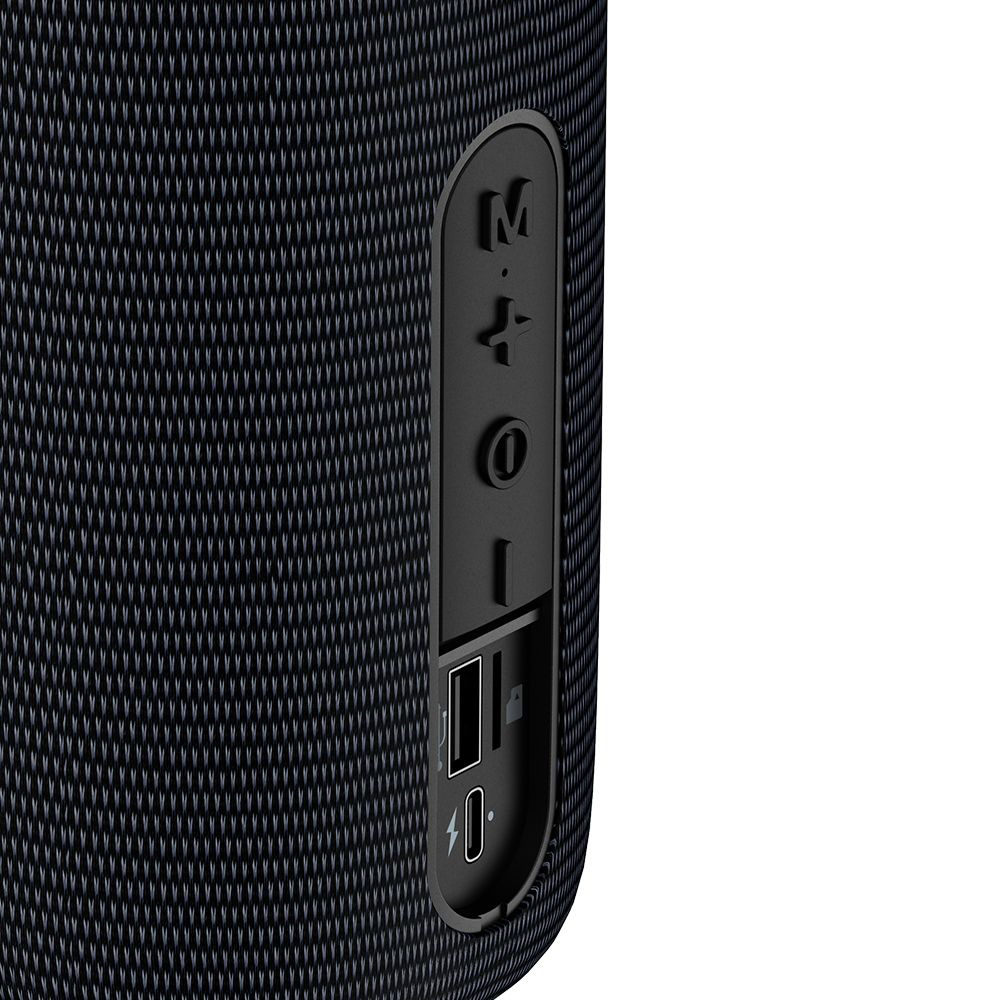 - Robusztus és hordozható kialakítás: Az ABS és strapabíró szövet hálós anyagból készült, IPX4 vízállósági besorolással rendelkező hangszóró ellenáll a fröccsenő víznek és pornak, így ideális választás kültéri használatra. Kompakt mérete (Ø89 x 171 mm) és mindössze 540 grammos súlya, valamint a praktikus hordozófül rendkívül egyszerűvé teszi a szállítást. Színe elegáns fekete.