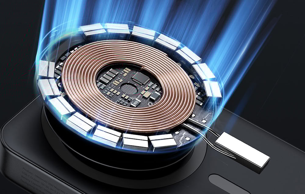 A powerbank 28 erős mágnessel rendelkezik a pontos illeszkedés érdekében. A 14N húzóerő és a 4440 GS mágnesek ereje biztosítja az eszköz biztonságos tartását még mozgás közben is, így ideális azok számára, akik értékelik a mobilitást és a biztonságot.