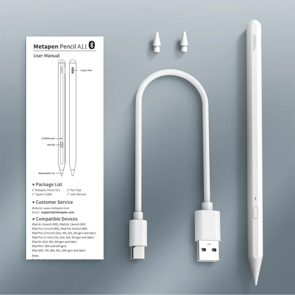 Metapen Pencil A11 iPadhez - Fehér A Metapen Pencil A11 egy precíziós eszköz, amelyet mindennapos iPad használatra terveztek, legyen szó jegyzetelésről, rajzolásról vagy kreatív feladatokról. Természetes írásélményt kínál a magas pixeles pontosságnak és a dőlésszög érzékenységének köszönhetően. A stabil Bluetooth kapcsolat, a gyors USB-C töltés és a hosszú akkumulátor-élettartam fokozza a felhasználói kényelmet. A karcsú kialakítás és a mágneses rögzítés biztosítja, hogy a stylus mindig kéznél legyen. Gyakorlati támogatást nyújt tanuláshoz, munkához és alkotáshoz. ~ Specifikációk:- Márka: Metapen
