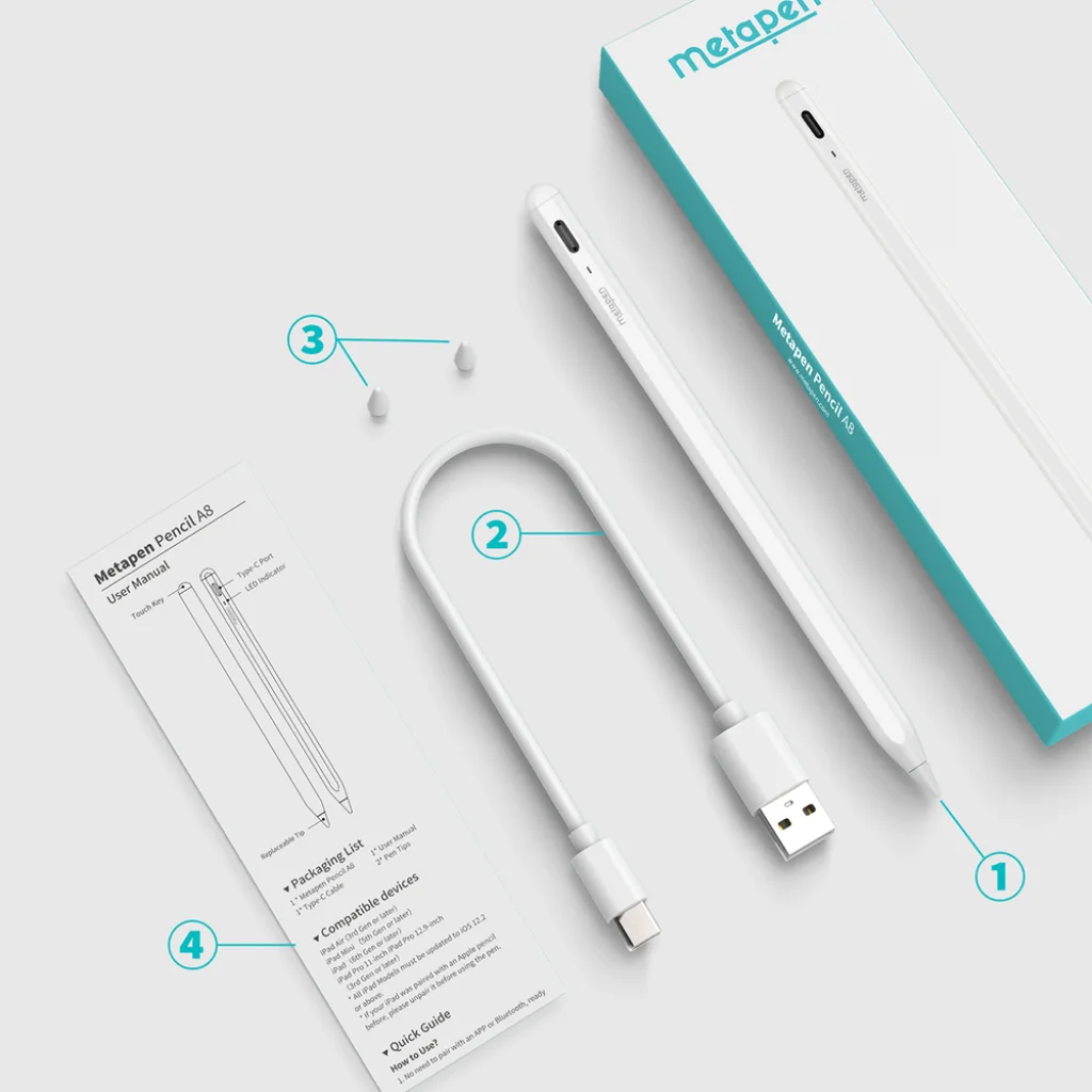 ~ Precíz írás és rajzolás A dőlésszög érzékenysége lehetővé teszi, hogy a stylus szögének változtatásával állítsa be a vonalvastagságot. A továbbfejlesztett vezérlőrendszer magas pontosságot, késésmentes működést és sima vonalfolyást biztosít, tökéletes mind a jegyzeteléshez, mind a kreatív munkához. Gyors töltés és hosszú üzemidő A Metapen Pencil A8 körülbelül 30 perc alatt feltöltődik, és akár 10 órás használatot biztosít. A gyors töltés lehetőséget nyújt a gyors munkakezdésre, az inaktivitás utáni automatikus kikapcsolás pedig segít az energia megtakarításban. Kényelmes használat és kéz felismerés A kéz felismerés lehetővé teszi, hogy kézfejét szabadon pihentesse az iPad képernyőjén írás vagy rajzolás közben, kényelmes és természetes munkamódszert biztosítva az alkalmazásokkal. Mágneses rögzítés és kényelmes tárolás A beépített mágnesek lehetővé teszik a stylus rögzítését a kompatibilis iPad oldalához, csökkentve az elvesztés kockázatát és könnyű tárolást biztosítva a használatok között. Tartós és biztonságos hegy A polírozott hegy, amely tartós polimer anyagból készült, megvédi a képernyőt a karcolásoktól, és magas precizitást tart fenn még gyakori használat esetén is. Tartalmaz tartalék hegyeket, növelve az egész kiegészítő tartósságát.