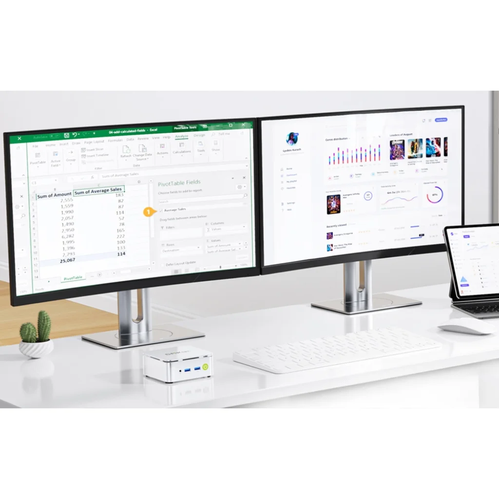 Ha több monitoron dolgozik, vagy a szórakozását a következő szintre szeretné emelni, a MiniPC G10 megfelel a kihívásnak. A három független HD (nagy felbontású, nagy felbontású) képernyő támogatása lehetővé teszi, hogy több monitorral kibővített munkaállomást hozzon létre, a 4K@60 Hz natív támogatása pedig lenyűgözően éles és egyenletes filmeket, játékokat vagy prezentációkat tesz lehetővé. Egyszerűen csatlakoztasson monitorokat vagy egy TV-t, hogy pillanatok alatt lenyűgöző többképernyős konfigurációt hozzon létre.
