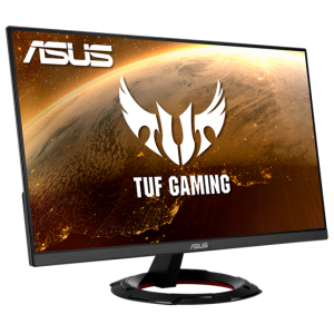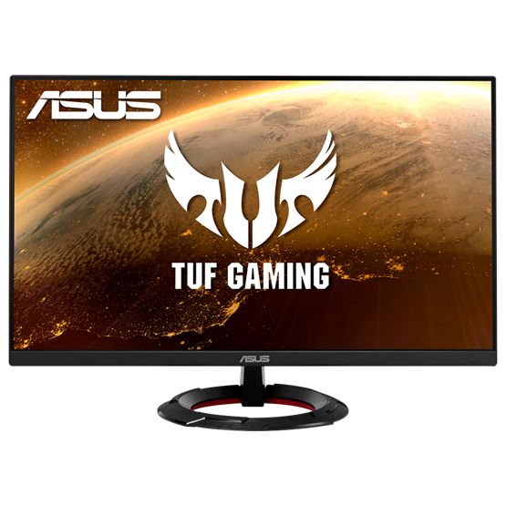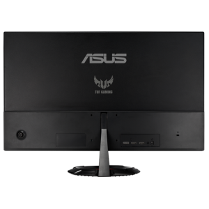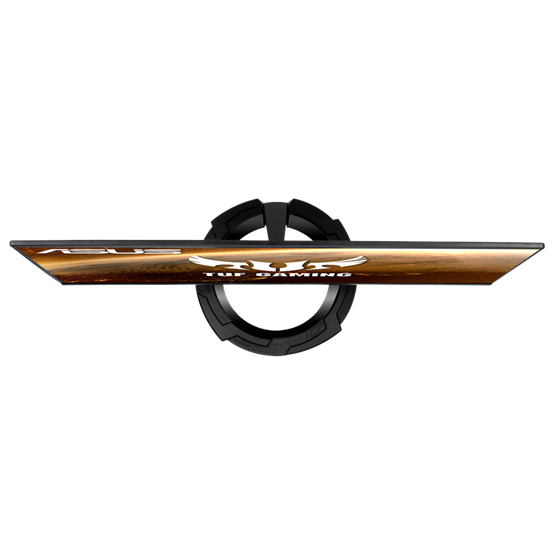 - TUF Gaming design: A monitor modern, agresszív megjelenése a jellegzetes kör alakú talppal és a hátsó panelen található TUF Gaming logóval (ahogy a képeken is látható) tökéletesen illeszkedik bármilyen gamer setupba.