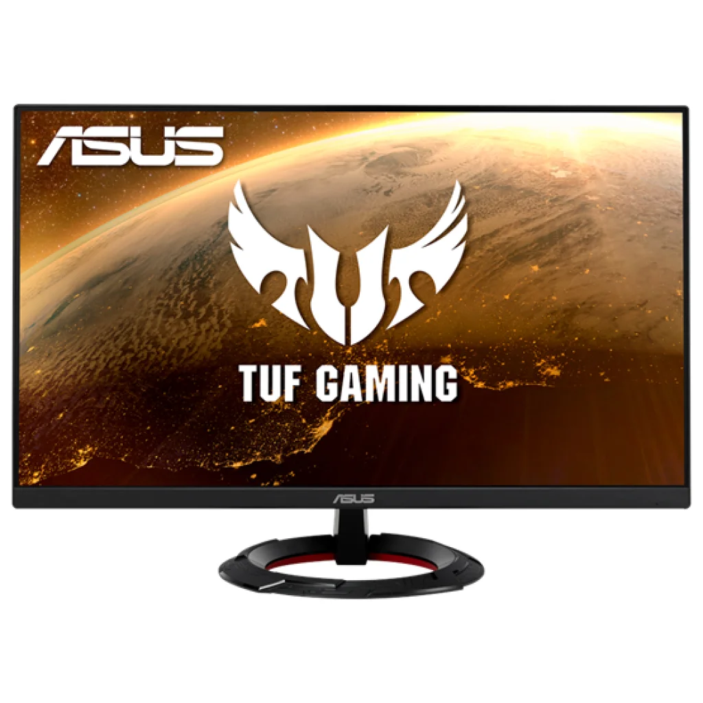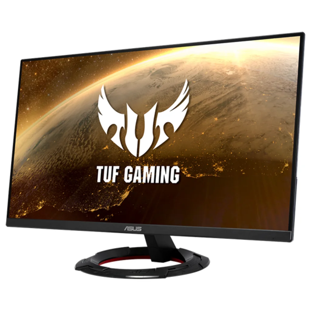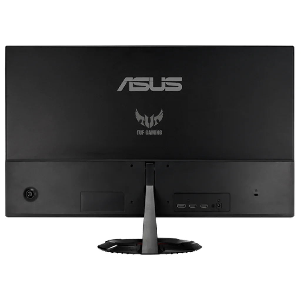 - TUF Gaming design: A monitor modern, agresszív megjelenése a jellegzetes kör alakú talppal és a hátsó panelen található TUF Gaming logóval (ahogy a képeken is látható) tökéletesen illeszkedik bármilyen gamer setupba.