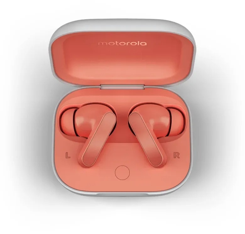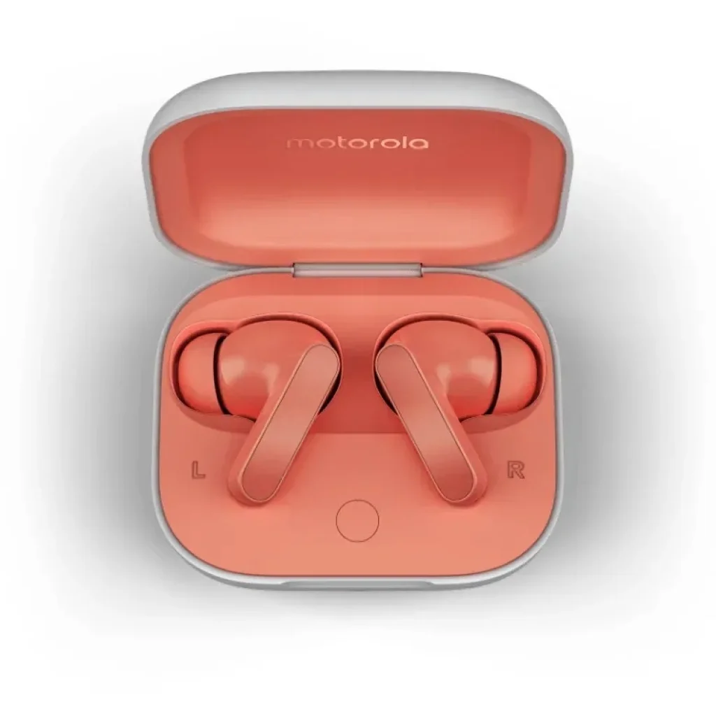 A "Peach Pink" árnyalatú fülhallgató és a töltőtok belseje azonnal magával ragadja a tekintetet, egyediséget és frissességet sugározva. A kompakt, lekerekített sarkú töltőtok elegáns, törtfehér külső borítást kapott, amelyet a Motorola ikonikus logója díszít, modern és letisztult megjelenést kölcsönözve. Az ergonomikus in-ear kialakítás és a puha szilikon fülpárnák hosszantartó kényelmet biztosítanak, így órákon át élvezheti kedvenc zenéit vagy hívásait fáradtság nélkül. A fülhallgató száras kialakítása nem csak esztétikus, de stabil illeszkedést is garantál, a tokban található "L" és "R" jelölések pedig megkönnyítik a helyes behelyezést.