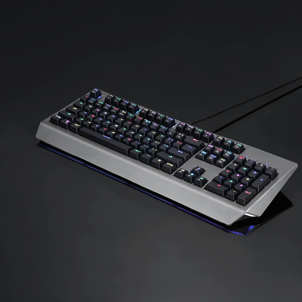 A beépített Flash chip jóval több beállítást, makrót és profil tárolását teszi lehetővé, mint a hagyományos EEPROM memóriával ellátott billentyűzetek, így maximális szabadságot kapsz a személyre szabásban. Az elegáns, strapabíró szürke ABS műanyag ház és a fekete billentyűsapkák modern, letisztult megjelenést kölcsönöznek a billentyűzetnek, ami bármilyen gamer setupba tökéletesen illeszkedik. A teljes méretű, angol kiosztású elrendezés dedikált numerikus paddal és multimédia funkciókkal (Fn billentyűkombinációval elérhető) biztosítja, hogy minden szükséges funkció kéznél legyen.
