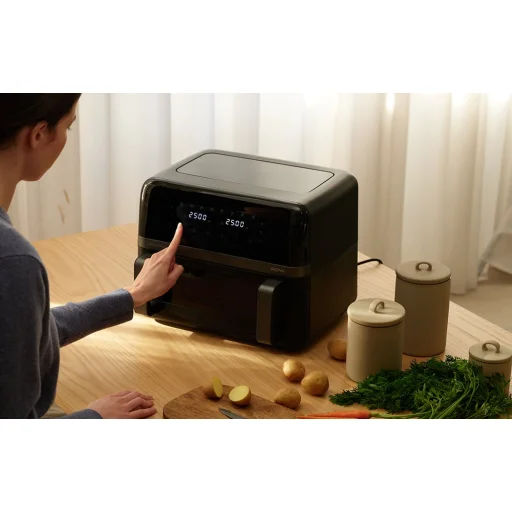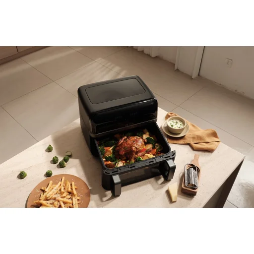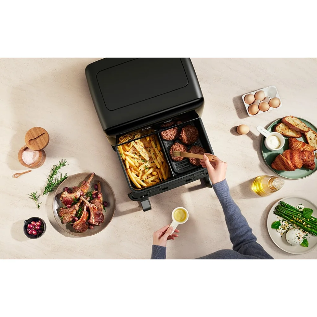 A készülék 9 literes FlexZone™ kosara lehetővé teszi, hogy kényelmesen váltson egy nagy rekesz és két különálló, egyenként 4,5 literes zóna között. Így egyszerre két különböző ételt készíthet - az ízek és szagok átjárása nélkül -, vagy nagyobb ételeket, például pizzát, rakott ételt vagy sült pulykát főzhet egy tágas rekeszben.