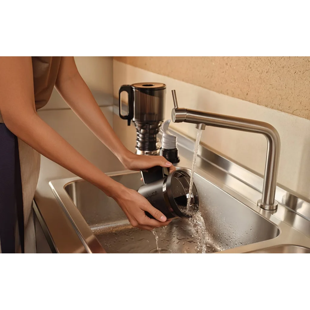 A készüléket a mindennapi kényelemre tervezték - intuitív, egyszerű összeszerelési és szétszerelési rendszerrel rendelkezik. Mindössze 3, a péppel érintkező elemet kell megtisztítania - a mellékelt kefe megkönnyíti a dolgát. Ezenkívül a fordított funkció lehetővé teszi, hogy a gyümölcscentrifugát szétszerelés nélkül eltömítse, ami megkönnyíti a kemény zöldségekkel való munkát.