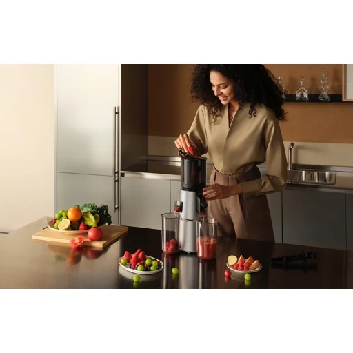 A MOVA SJ10 lassú üzemű gyümölcscentrifuga új értéket ad a friss gyümölcslevek ízének, a kényelemnek és a teljes tápértéknek a mindennapi étrendben. A 120 milliméteres nyílásnak köszönhetően egész gyümölcsöket és zöldségeket dobhat bele szeletelés nélkül, így minden reggel időt takaríthat meg. A kétlépcsős préselési technológia és a precíziós csiga 10%-kal növeli a lé mennyiségét a hagyományos gyümölcscentrifugákhoz képest, így ugyanannyi alapanyagból több ízletes italt kínál.