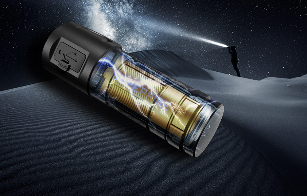 A TH03 zseblámpát egy erőteljes 16340-es típusú akkumulátor táplálja, amely egyetlen töltéssel körülbelül 2 órás üzemidőt biztosít. Az USB-C töltőport lehetővé teszi a gyors és kényelmes töltést különféle eszközökkel. Emellett egy LED jelzi az akkumulátor töltöttségi állapotát: a piros fény a töltést, a kék fény a teljes töltést jelenti. Ez a praktikus megoldás kiküszöböli a hirtelen energiafogyás kockázatát, biztosítva, hogy a zseblámpa minden helyzetben készen álljon a használatra.