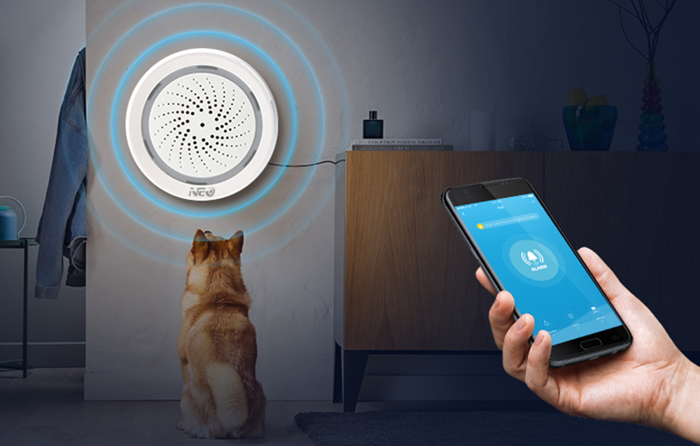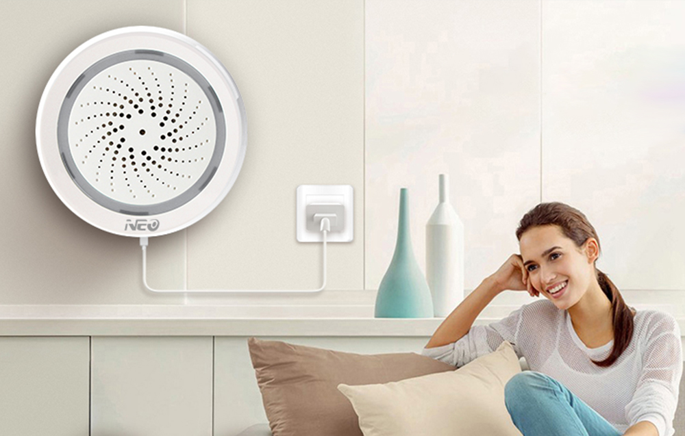 A NEO riasztó szirénát a felhasználók igényeinek megfelelően alakították ki, így lehetőségek vannak a személyre szabásra. Válassz a 18 különböző hang közül, hogy a saját preferenciáid szerint állíthasd be. Továbbá két módon is táplálhatod - USB-mini kábellel vagy két CR123A elemmel. Az alkalmazásban beállíthatod a szobában kívánt hőmérsékletet és páratartalmat is. Amikor ez a tartomány túllépésre kerül, a sziréna automatikusan riasztást ad, még akkor is, ha nincs áramellátás.