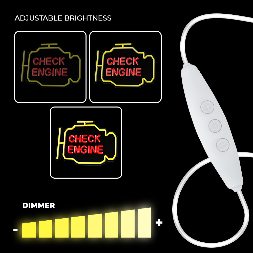 A készülékbe épített sötétítő funkció lehetővé teszi a neon által kibocsátott fényerő szabályozását. Emellett a Dino egy BE/Ki kapcsolóval van felszerelve, amely lehetővé teszi a neon egyszerű be- és kikapcsolását anélkül, hogy áramforráshoz csatlakoztatnánk vagy leválasztanánk.