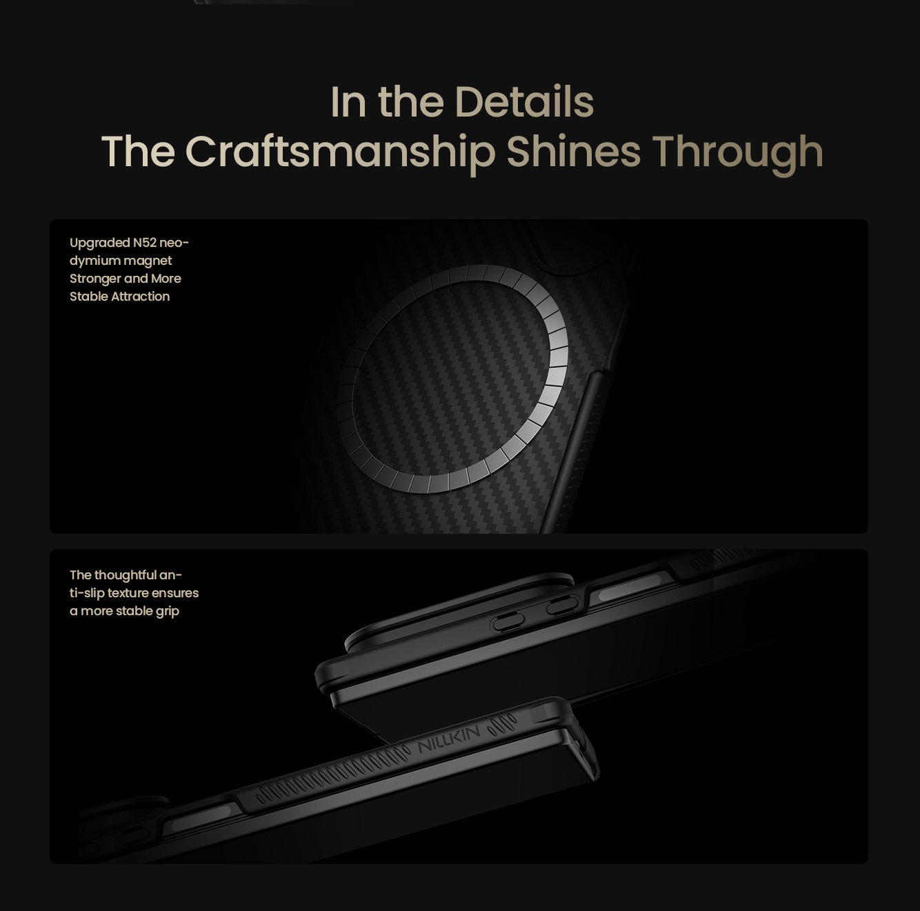 A "In the Details, The Craftsmanship Shines Through" jelmondat tökéletesen tükrözi a Nillkin CarboProp tok aprólékos kidolgozottságát.