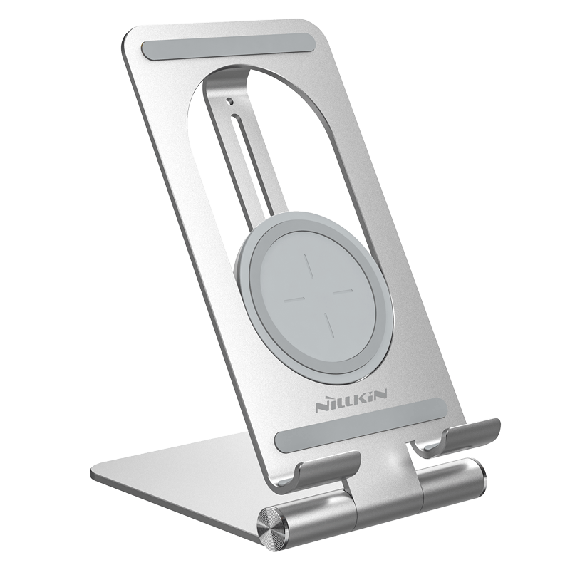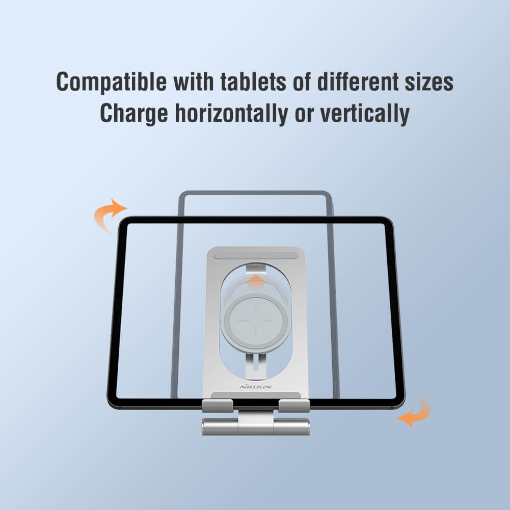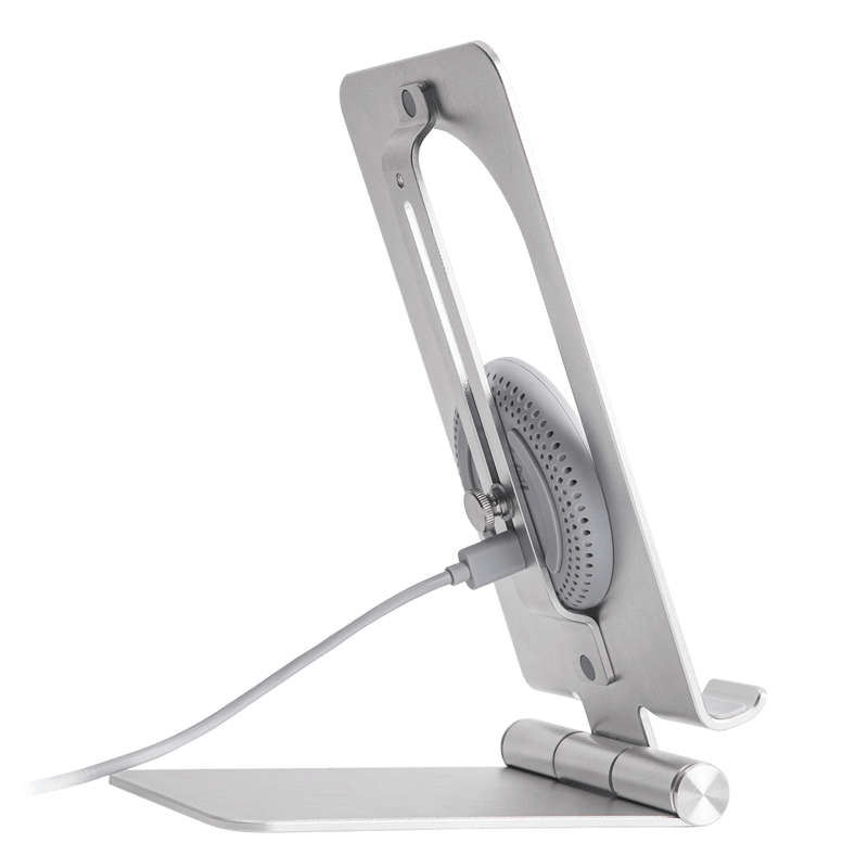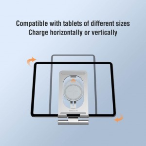 Flexibilis, tetszőleges szögben beállítható tablet tartó állvány. Függőleges és vízszintes elhelyezést is támogató konstrukció. 15W (Max) teljesítményű vezeték nélküli gyorstöltéssel. A talp és tablettel érintkező felülete csúszásmentes szilikonnal burkolt. Töltőkábel csatlakoztatása nélkül, csak állványként is használható.