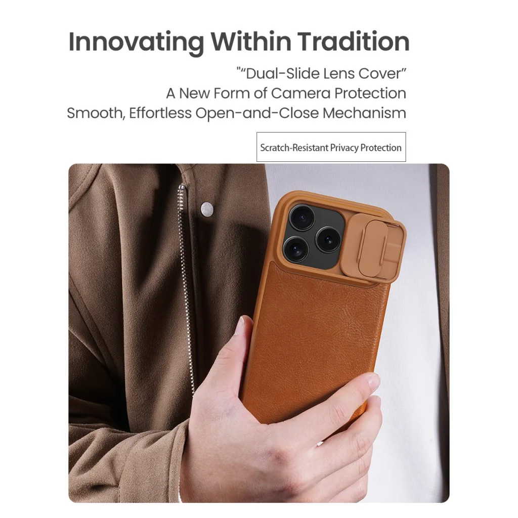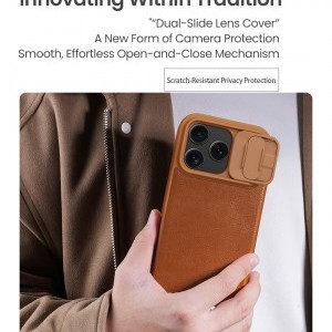 A Nillkin QIN Book PRO fliptok kiváló minőségű PU bőrből készült, oldalra nyílik, mint egy könyv, és ráadásul a klasszikus QIN Bookhoz képest csúsztatható kameravédő fedéllel van ellátva.