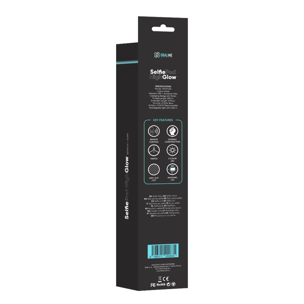 Az OBAL:ME SelfiePod High Glow Black a legfejlettebb tripod-selfie rendszer a kínálatban, erősebb LED panellel, nagyobb fényerővel, hosszabb nyújtási mechanizmussal és megerősített tripod lábakkal.