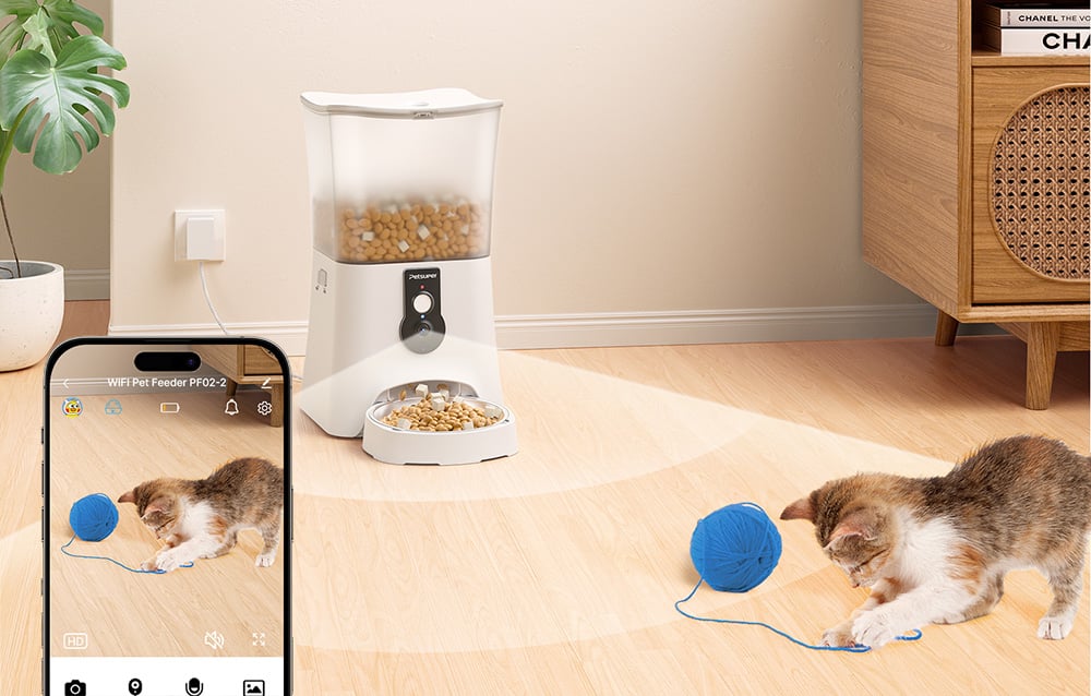 A Petsuper PF01-2 okos etető egy 1080P HD kamerával van felszerelve, amely bármikor tiszta és részletgazdag képet biztosít háziállatáról, köszönhetően az éjjellátó funkciónak. A 150° széles látószögű lencsének köszönhetően nagyobb területet figyelhet meg, így jobban ellenőrizheti háziállata környezetét. Emellett, amikor mozgást észlel, értesítést kap a mobilkészülékére.