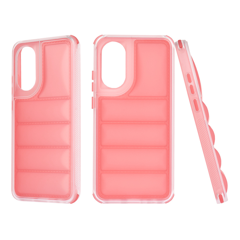 A "Wave Shield" elnevezés tökéletesen tükrözi a tok különleges, steppelt mintázatát, amely nemcsak esztétikus, hanem extra párnázottságot is biztosít a hátlapon. Bár a termék megnevezése "piros" színt említ, a tok valójában egy elegáns, áttetsző rózsaszín árnyalatban pompázik, amely lágyan engedi át a telefon eredeti színét, miközben modern, friss megjelenést kölcsönöz. A tok oldalai enyhén bordázottak, ami biztos fogást garantál, megelőzve a véletlen kicsúszást a kézből.