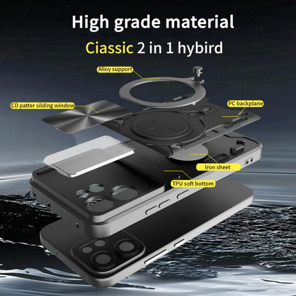 - Prémium hibrid kialakítás: A Techsuit CamGuard Pro egy "Classic 2 az 1-ben hibrid" tok, mely magas minőségű anyagok (robosztus PC hátlap, TPU puha alsó rész, ötvözet támaszték és vaslemez) kombinációjával készül. Ez a réteges szerkezet kiváló ütésállóságot és tartósságot biztosít.