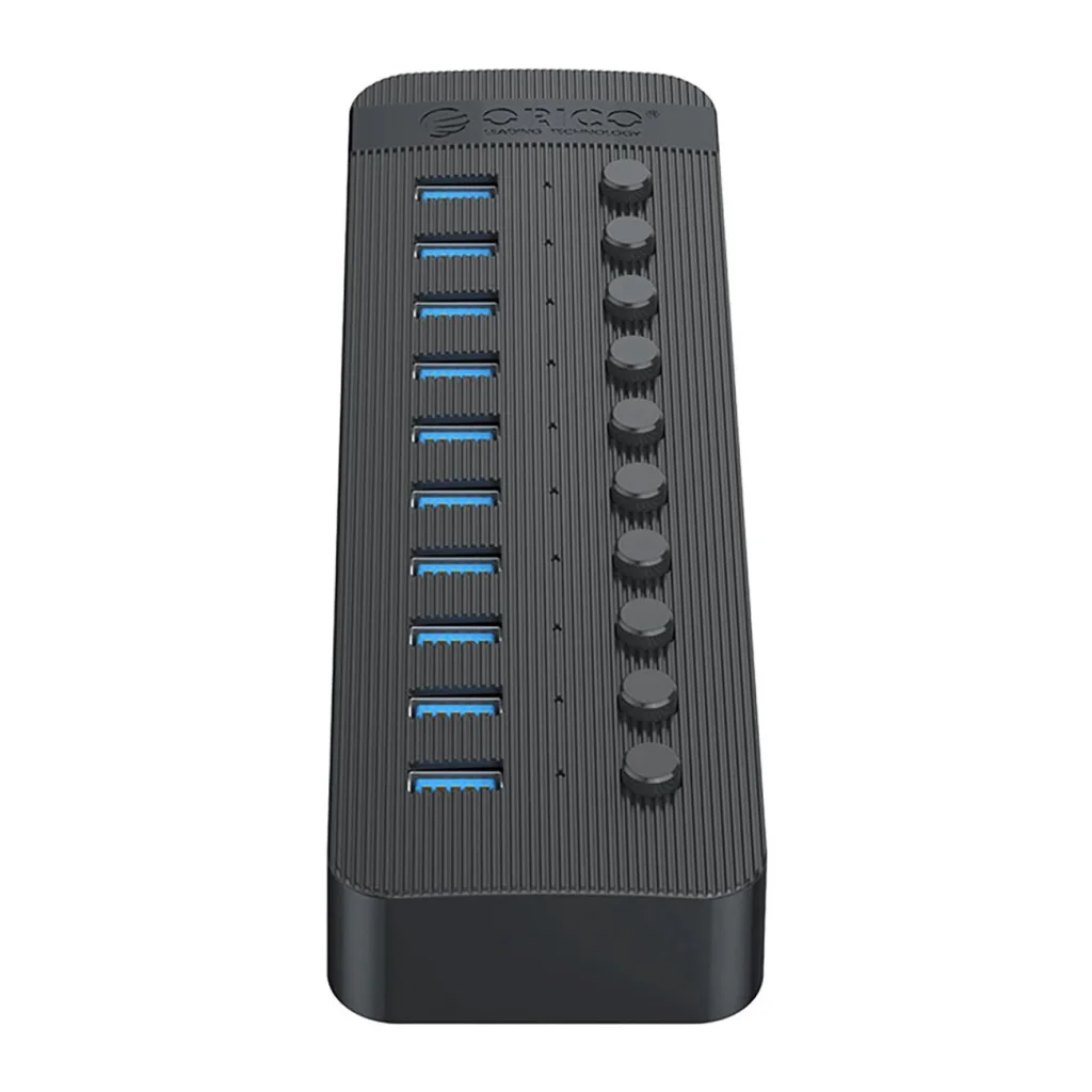 Orico CT2U3-10AB 10x USB-A 3.0 Hub kapcsolókkal - Fekete Az Orico CT2U3-10AB Hub egyedülálló eszköz, amely páratlan funkcionalitást biztosít, kombinálva legfeljebb 10 USB 3.0 portot egy kompakt eszközben. Minden porthoz külön kapcsoló tartozik, így energiát takaríthat meg és biztosíthatja a csatlakoztatott eszközök biztonságát. Az USB 3.0 portok lehetővé teszik az adatok átvitelét 5 Gbps sebességgel, így ideális megoldás a nagy fájlokkal vagy igényes eszközökkel dolgozók számára. Megbízható működés, elegáns kialakítás és könnyű használat teszik kiváló választássá irodai, stúdió és professzionális felhasználásra. Ha bővíteni szeretné USB eszközeit és biztosítani azok stabil működését, az Orico CT2U3-10AB hub megfelel az elvárásainak! ~ Műszaki adatok: