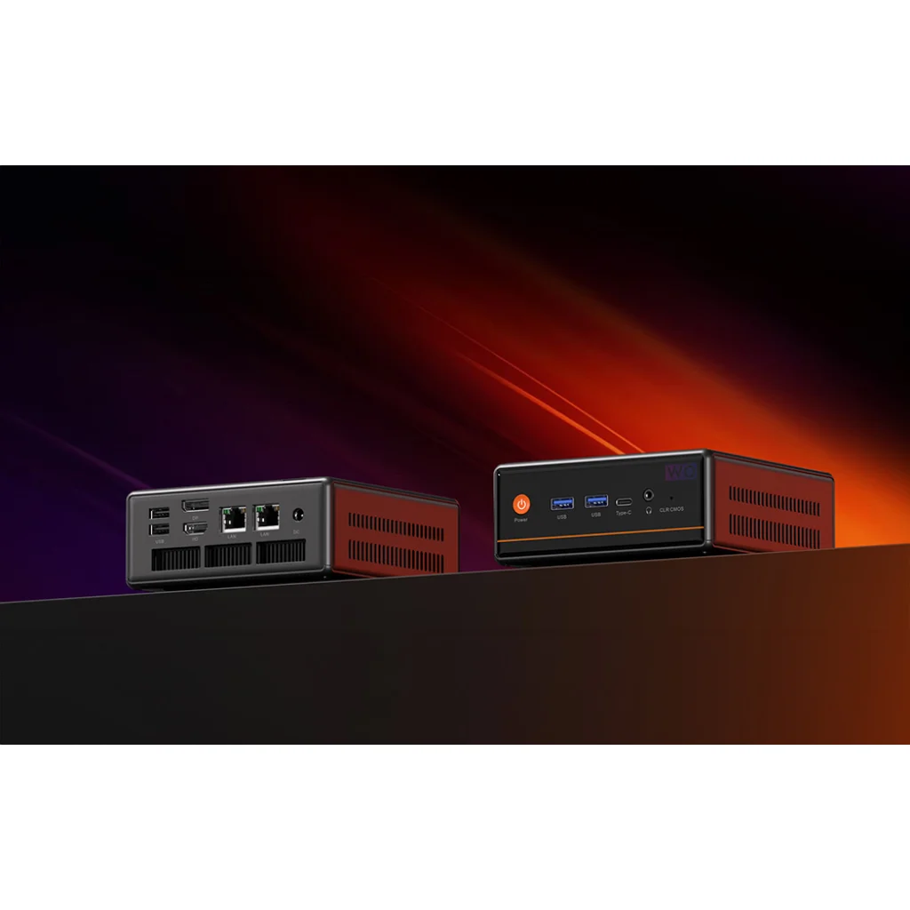 A Peladn WO4 Mini PC kiterjedt csatlakozókkal rendelkezik, amelyek megkönnyítik több eszköz egyidejű csatlakoztatását. A ház elülső részén található a bekapcsológomb, két USB 3.2 Gen 2 port, egy USB-C port, egy kombinált audio jack és egy CMOS Reset gomb. A hátsó panelen két USB 2.0 port, HDMI és DisplayPort kimenetek, Gigabit Ethernet és 2,5G Ethernet csatlakozók, valamint egy 19 V-os DC tápcsatlakozó található. Ez a konfiguráció nagy rugalmasságot biztosít mind otthoni, mind professzionális alkalmazásokhoz.
