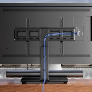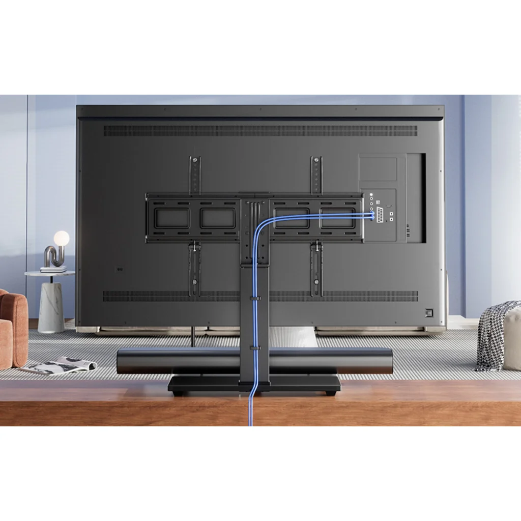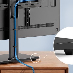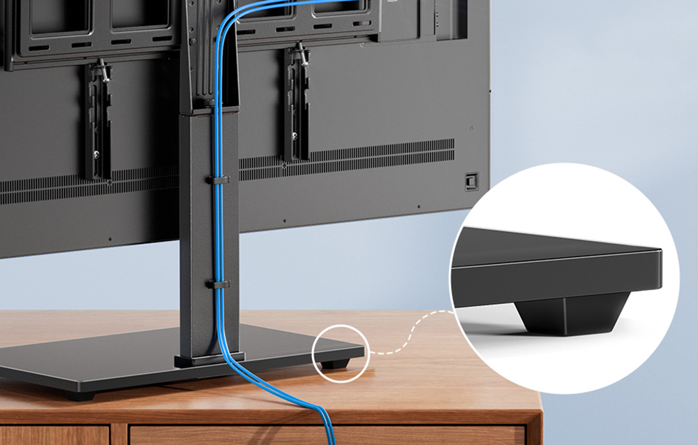 A konzol integrált tervezése megkönnyíti a kábelek kezelhetőségét, ami esztétikus megjelenést biztosít és megelőzi a véletlen sérüléseket. A csúszásmentes párnák garantálják a TV stabilitását bármilyen felületen.