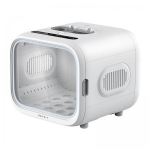 Eszköz tervezése: A PetKit kisállat szárító kocka alakú, lekerekített sarkokkal rendelkezik. Az eszköz három oldalán található szellőzőnyílások biztosítják friss levegőt kedvence számára, és gyengéd szellőt biztosítanak a bunda szárításához, még az érzékeny területeken is. Az eszköz alján egy kivehető panel található a könnyű tisztítás érdekében. Az AIRSALON MAX Pro belsejében elég nagy hely van két macska vagy kis kutya kényelmes elhelyezésére, hogy kinyúlhassanak és élvezhessék a meleg légáramot. A szárító előlapján átlátszó ajtók találhatók, hogy figyelemmel kísérhesse kedvence jólétét. Emellett egy érintésérzékeny LED panel is található a felhasználóbarát kezelés érdekében. A szárító mennyezetében beépített fény található, amely lehetővé teszi az állat szárítását akár éjszaka is.