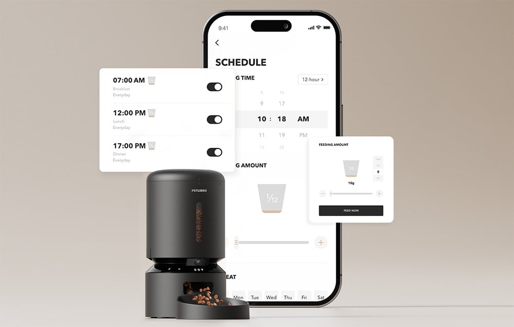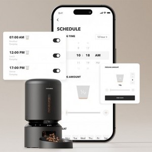 Kezelje okostelefonjáról kedvence etetési ütemtervét. A Petlibro dedikált alkalmazásával (amely támogatja a 2,4 és 5 GHz-es Wi-Fi-t) beállíthatja az adagok számát, az étkezési időpontokat és az adagok méretét kedvence étrendjének és igényeinek megfelelően. Tökéletes azoknak a gazdiknak, akik szeretnének gondoskodni kedvencük egészséges táplálkozási szokásairól, és nem aggódnak amiatt, hogy időben megetették-e őket. Akár a munkahelyén, akár nyaraláson vagy üzleti úton van, néhány kattintással mindent kézben tarthat.