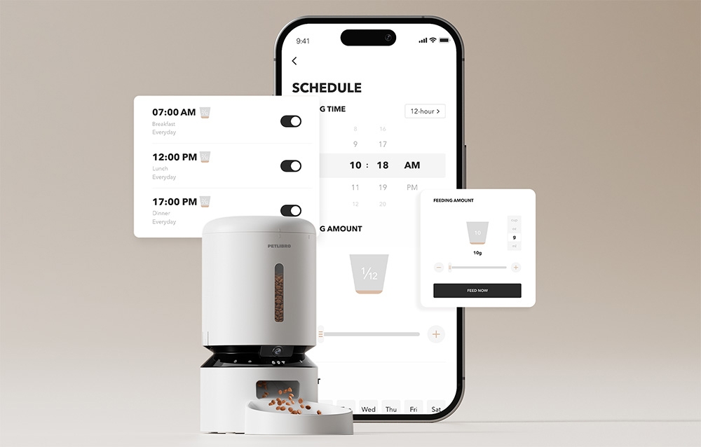 Kezelje kedvence etetési ütemtervét okostelefonjáról. A Petlibro dedikált alkalmazásával (amely támogatja a 2,4 és 5 GHz-es Wi-Fi-t) beállíthatja az adagok számát, az étkezési időpontokat és az adagok méretét kedvence étrendjének és igényeinek megfelelően. Tökéletes azoknak a gazdiknak, akik szeretnének gondoskodni kedvencük egészséges táplálkozási szokásairól, és nem aggódnak azon, hogy időben etették-e meg őket. Akár munkahelyén, akár nyaraláson vagy üzleti úton van, néhány kattintással mindent kézben tarthat.