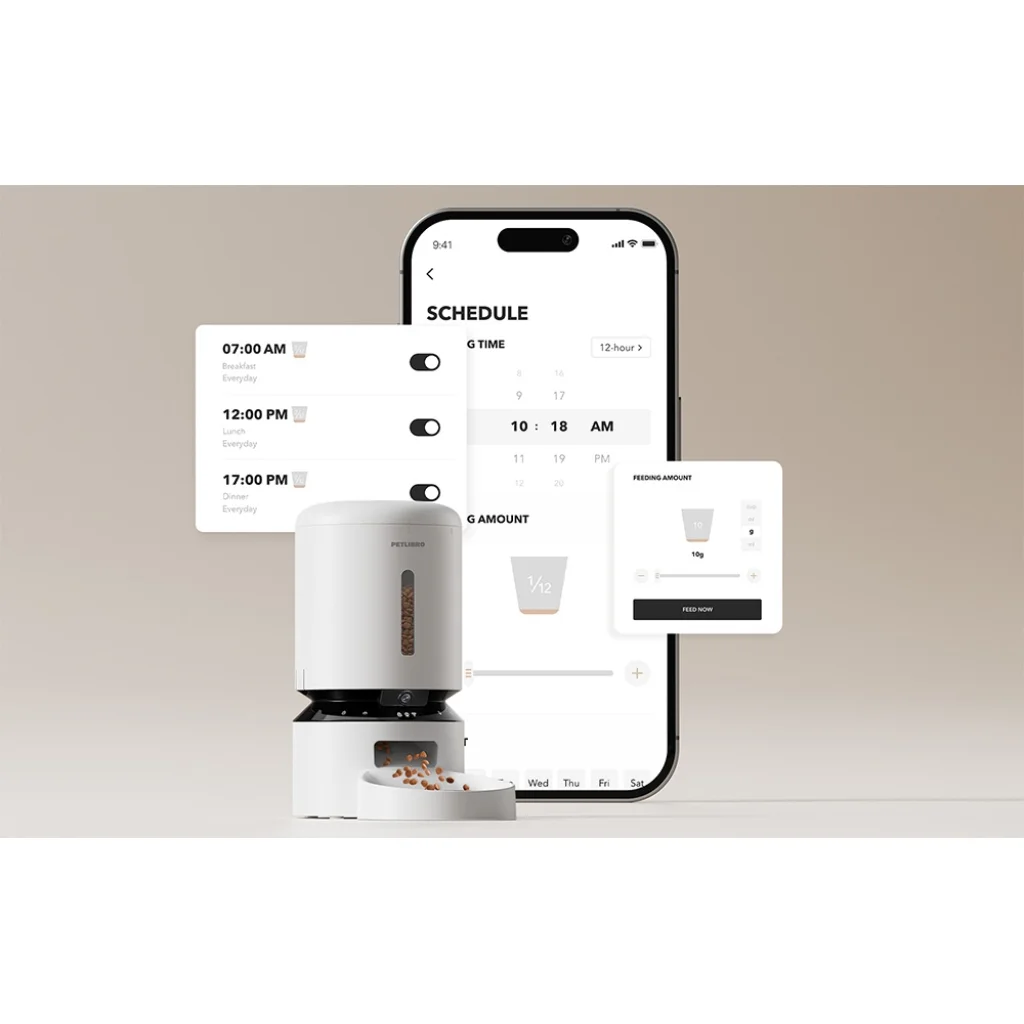 Kezelje kedvence etetési ütemtervét okostelefonjáról. A Petlibro dedikált alkalmazásával (amely támogatja a 2,4 és 5 GHz-es Wi-Fi-t) beállíthatja az adagok számát, az étkezési időpontokat és az adagok méretét kedvence étrendjének és igényeinek megfelelően. Tökéletes azoknak a gazdiknak, akik szeretnének gondoskodni kedvencük egészséges táplálkozási szokásairól, és nem aggódnak azon, hogy időben etették-e meg őket. Akár munkahelyén, akár nyaraláson vagy üzleti úton van, néhány kattintással mindent kézben tarthat.