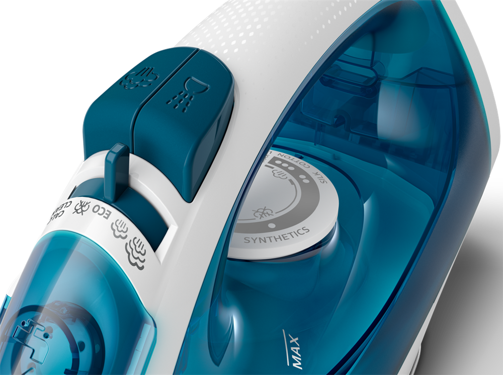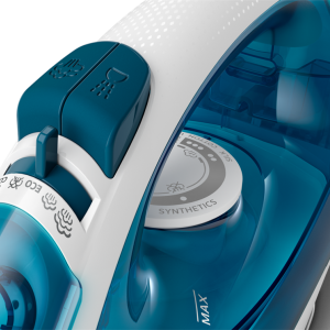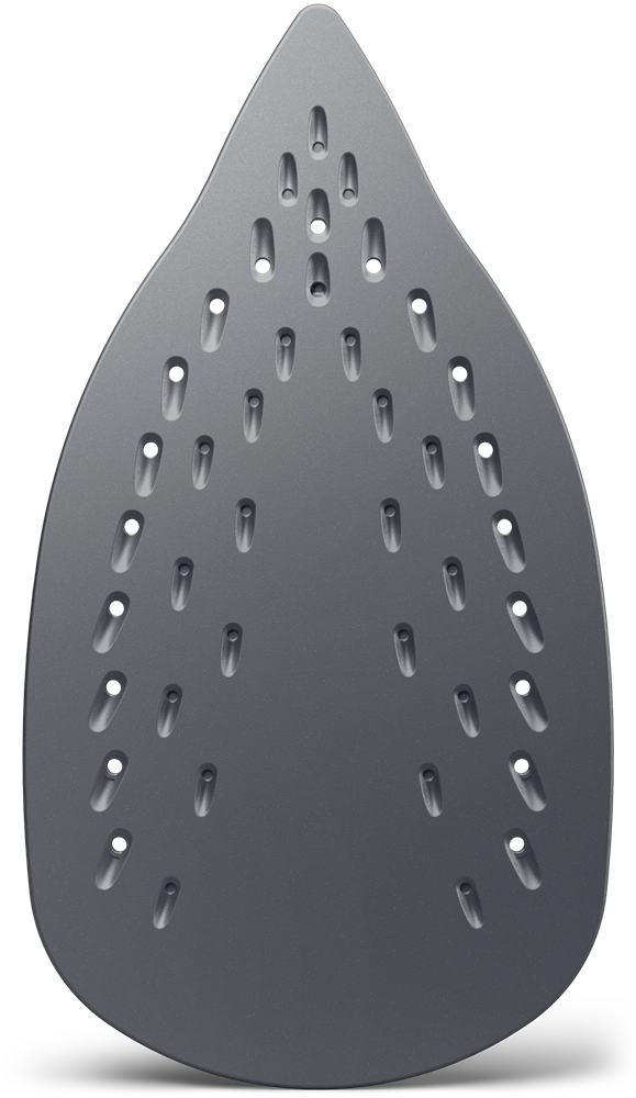 - Optimalizált vasalótalp: A speciálisan kialakított vasalótalp számos gőzkimeneti nyílással biztosítja az egyenletes gőzeloszlást, és könnyedén csúszik minden anyagon. Hegyes orra könnyedén éri el a gomb körüli és más nehezen hozzáférhető területeket.