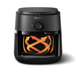 A Philips Airfryer 1000 L NA120/00 a továbbfejlesztett RapidAir technológiát használja, amely egyedi, csillag alakú kialakításával optimális légáramlást biztosít. Ahogy a képeken is látható, a forró levegő örvénylő mozgása egyenletesen süti meg az ételt minden oldalról, kívül ropogós, belül puha textúrát eredményezve – mindezt akár 90%-kal kevesebb zsírral, mint a hagyományos mélyhűtött olajban sütés esetén.