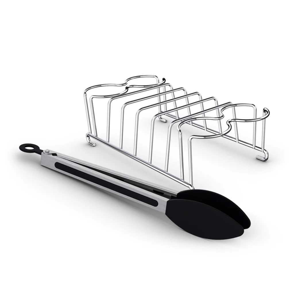 A szett egy masszív, prémium minőségű, krómacélból készült reggeliző rácsot és egy strapabíró, szilikon végű csipeszt tartalmaz, amelyek kifejezetten az Airfryer készülékekhez lettek tervezve. A rács ideális megoldást nyújt, hogy egyszerre több szelet kenyeret vagy péksüteményt piríts ropogósra az Airfryer forró levegős technológiájával, miközben a két oldalán elhelyezett tartókkal akár két tojást is megfőzhetsz vagy melegen tarthatsz.