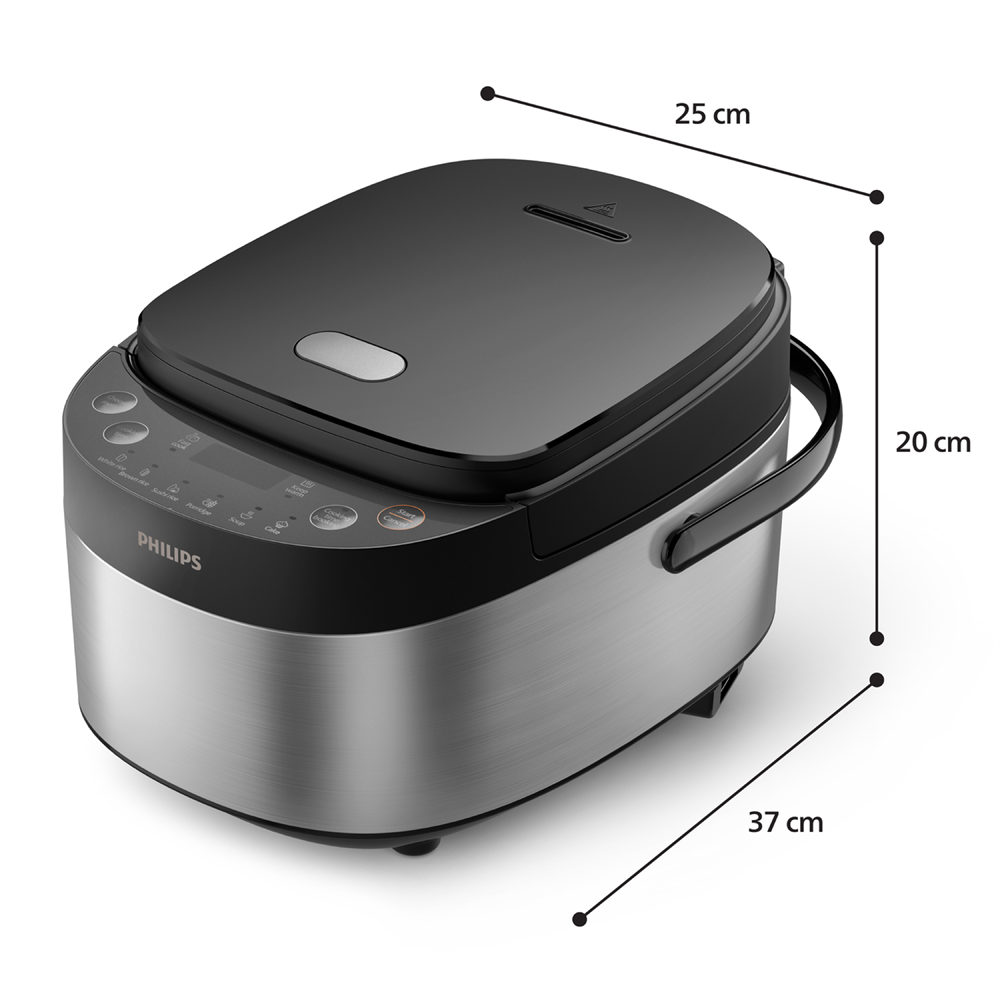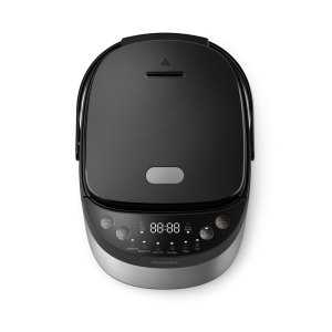 - Kompakt és elegáns design: A letisztult, modern fekete és szálcsiszolt fémhatású kivitelnek köszönhetően a rizsfőző bármilyen konyhában jól mutat. Kompakt mérete (kb. 37 cm hosszú, 25 cm széles és 20 cm magas) révén könnyen elhelyezhető és tárolható.
