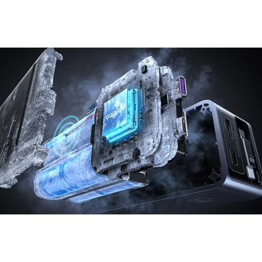 Az UGREEN lehetővé teszi három kimenet egyidejű használatát: a beépített USB-C kábelt, az USB-C portot és az USB-A portot. Alacsony áramú módot is támogat, amely ideális kisebb kiegészítők, például fejhallgatók vagy okosórák töltéséhez.